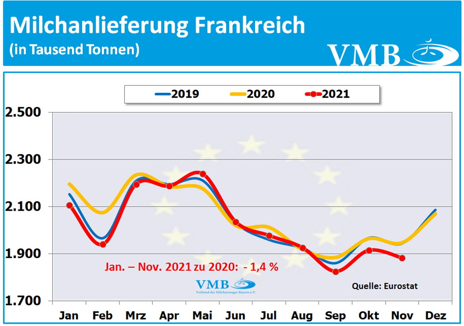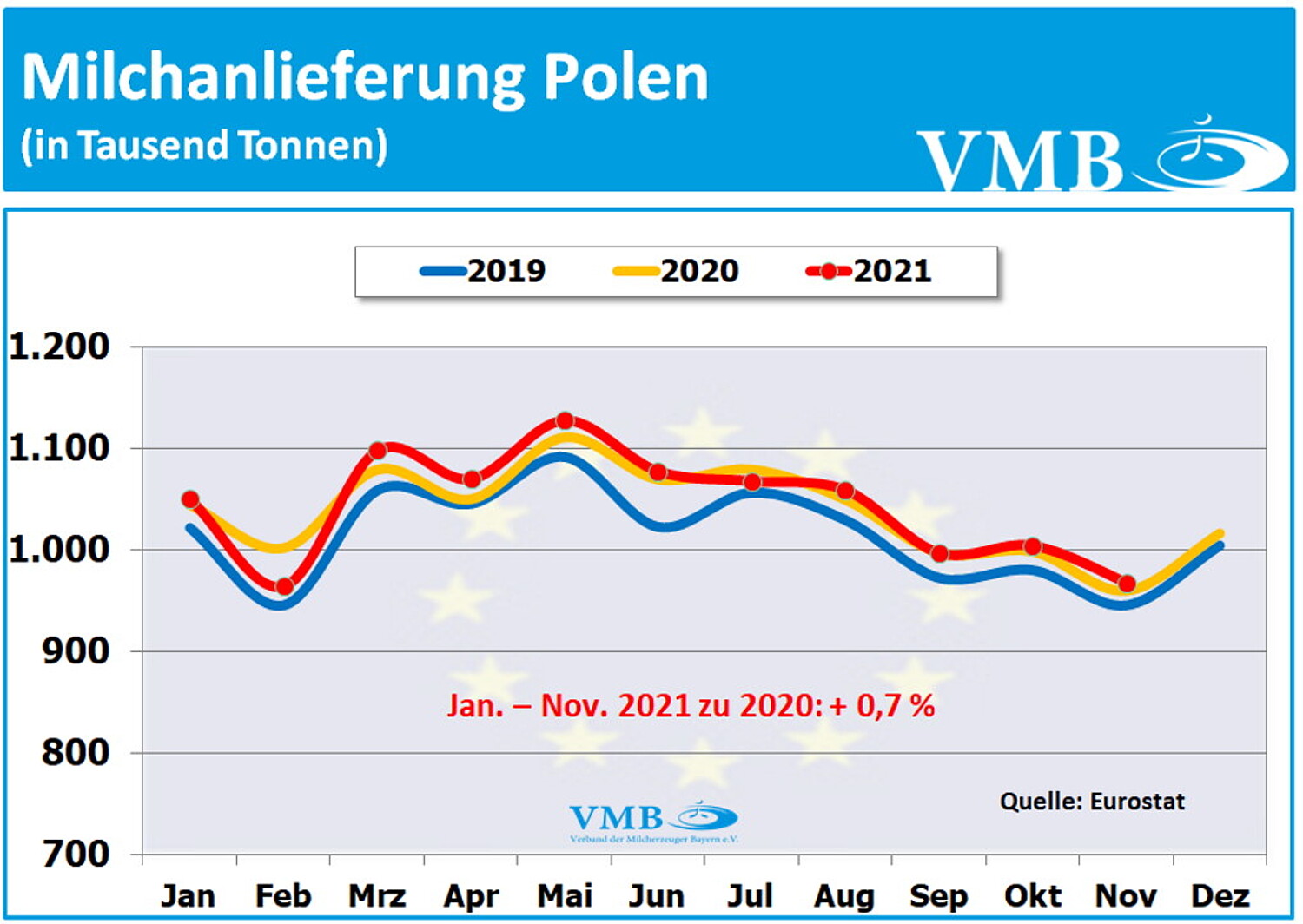 Da sich der Anlieferungstrend in den EU-Staaten seit Beginn des zweiten Halbjahres 2021 bis zum Jahresende nicht wesentlich geändert hat, ist davon auszugehen, dass der Vorsprung aus dem ersten Halbjahr schmilzt und die Jahresmilchmenge in etwa das Vorjahresergebnis erzielen wird. Das Erzeugungsniveau wird sich bei etwa 144,38 Milliarden Kilogramm Milch einpendeln (Vorjahr: 144,23 Milliarden Kilogramm Milch). Prozentual ergibt dies einen Abstand zur Vorjahresmilchmenge von nur noch knapp 0,1 Prozent, also unverändert!