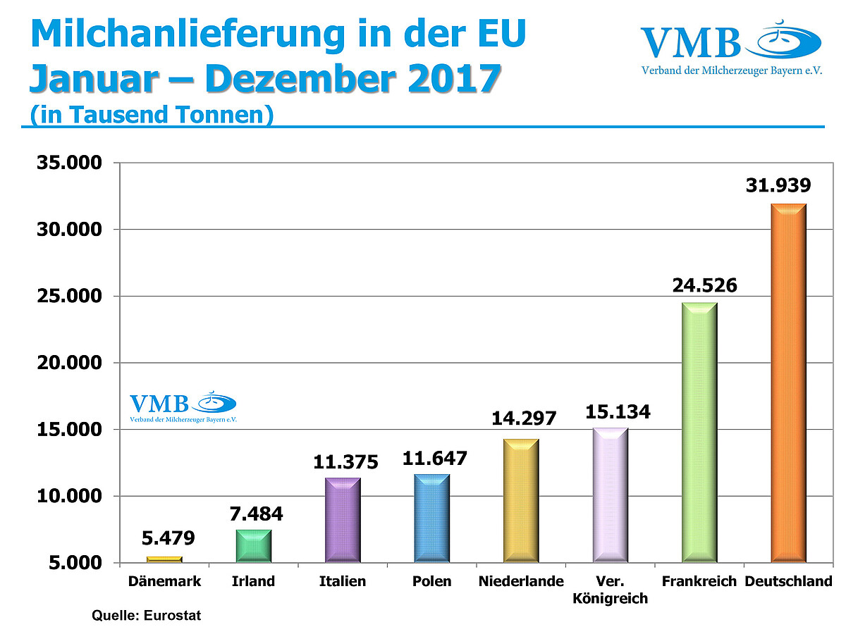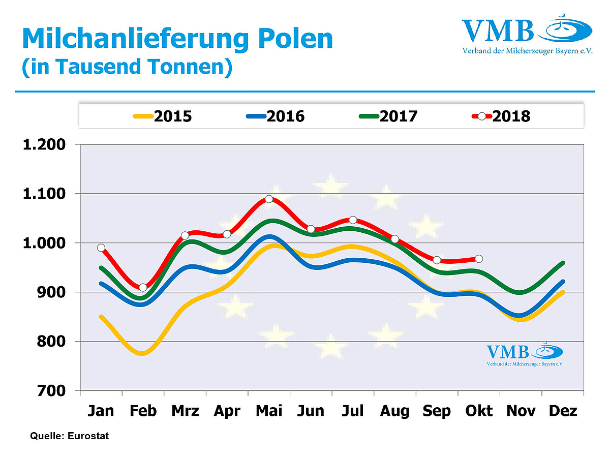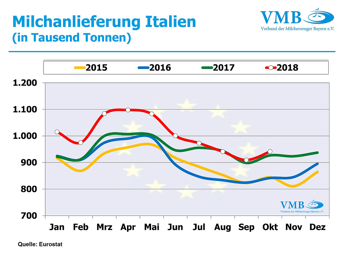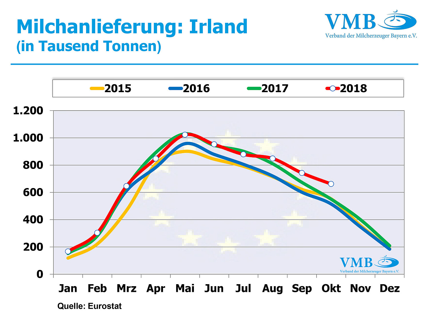 Sehr unterschiedlich ausgeprägt bleibt die Michanlieferung in den verschiedenen europäischen Staaten. Obwohl, infolge der extremen heißen Temperaturen im Sommer 2018, die Prognosen auf ein niedriges Anlieferungsverhalten hofften, folgte in allen Ländern die Milcherzeugung nicht dieser Vorhersage. Die Zahlen von Irland, Polen, Dänemark und Italien heben sich gegenüber dem Vorjahr teilweise deutlich ab.