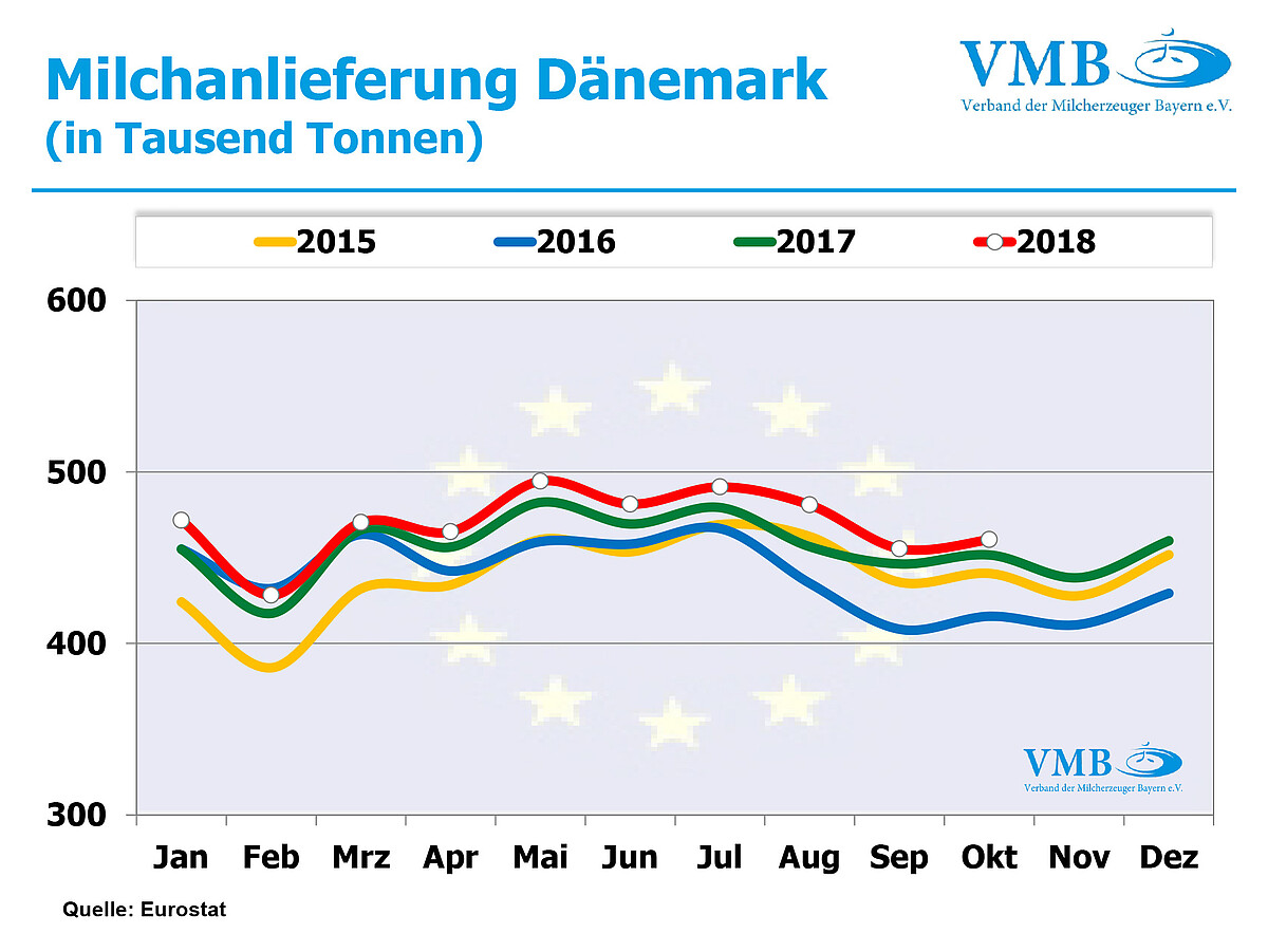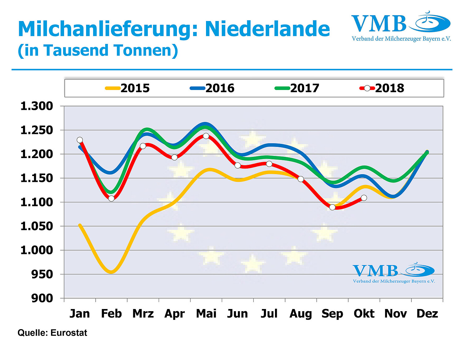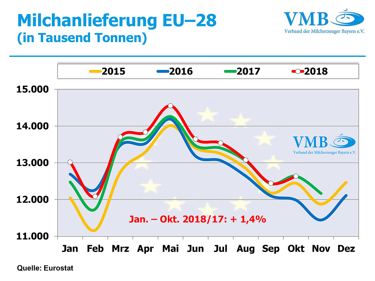 Trotz des Vorsprungs gegenüber dem Vorjahr, wurde der Abstand zu 2017 von Monatsberechnung zu Monatsberechnung geringer. Die anfänglichen Differenzen von über 4 Prozent haben zunehmend abgenommen, so dass die Erzeugungsmenge zum Jahresende 2018 um annähernd ein Prozent höher als im Jahr 2017 sein wird. Die aktuelle Oktober-Milchanlieferung befindet sich nun exakt auf dem Vorjahresniveau. Übernimmt man die Prognosen der einzelnen EU-Mitgliedsstaaten, so wird das Erzeugungspotential zum Jahresabschluss 2018 unter den Monatswerten liegen.
