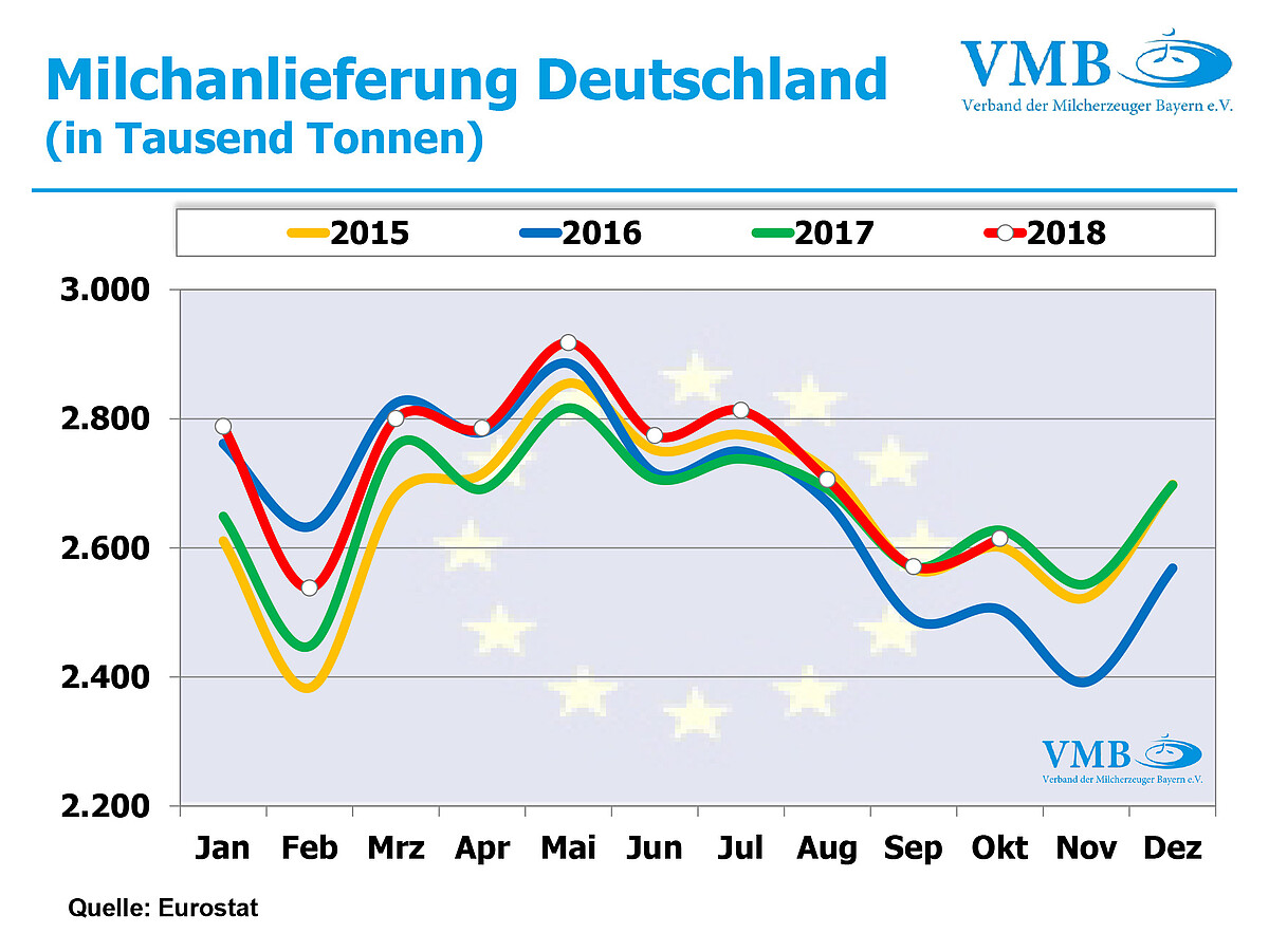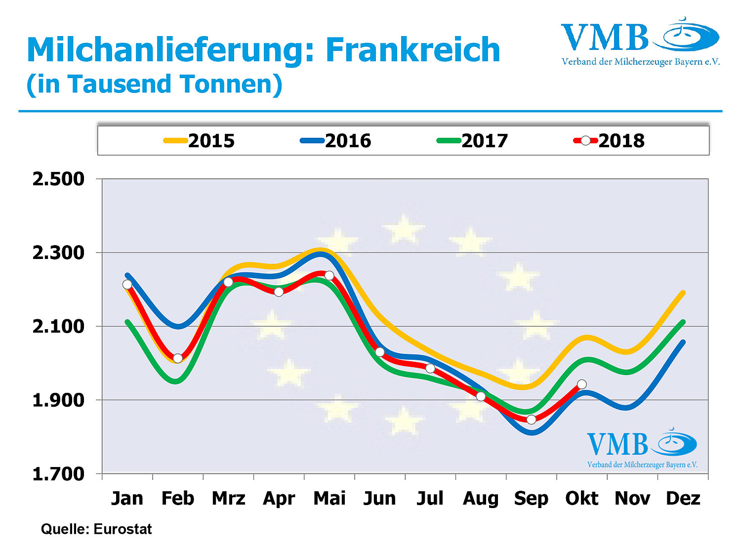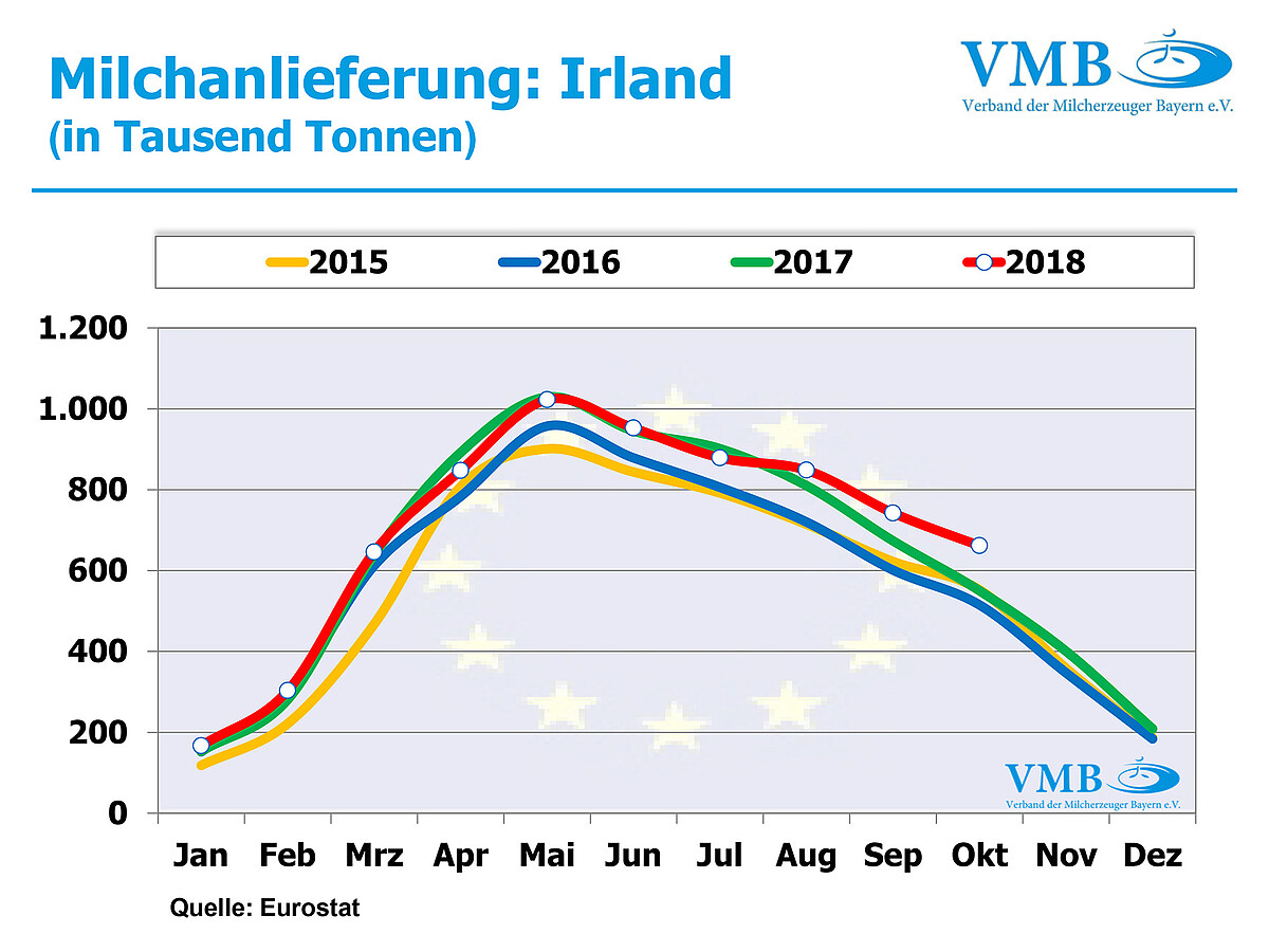 Trotz des Vorsprungs gegenüber dem Vorjahr, wurde der Abstand zu 2017 von Monatsberechnung zu Monatsberechnung geringer. Die anfänglichen Differenzen von über 4 Prozent haben zunehmend abgenommen, so dass die Erzeugungsmenge zum Jahresende 2018 um annähernd ein Prozent höher als im Jahr 2017 sein wird. Die aktuelle Oktober-Milchanlieferung befindet sich nun exakt auf dem Vorjahresniveau. Übernimmt man die Prognosen der einzelnen EU-Mitgliedsstaaten, so wird das Erzeugungspotential zum Jahresabschluss 2018 unter den Monatswerten liegen.