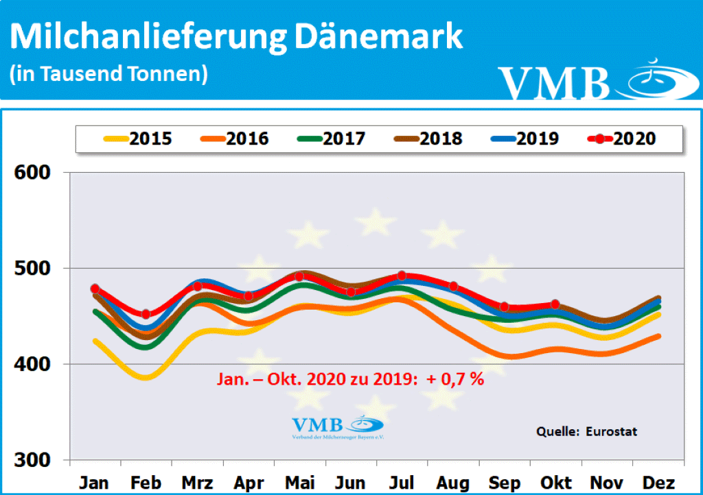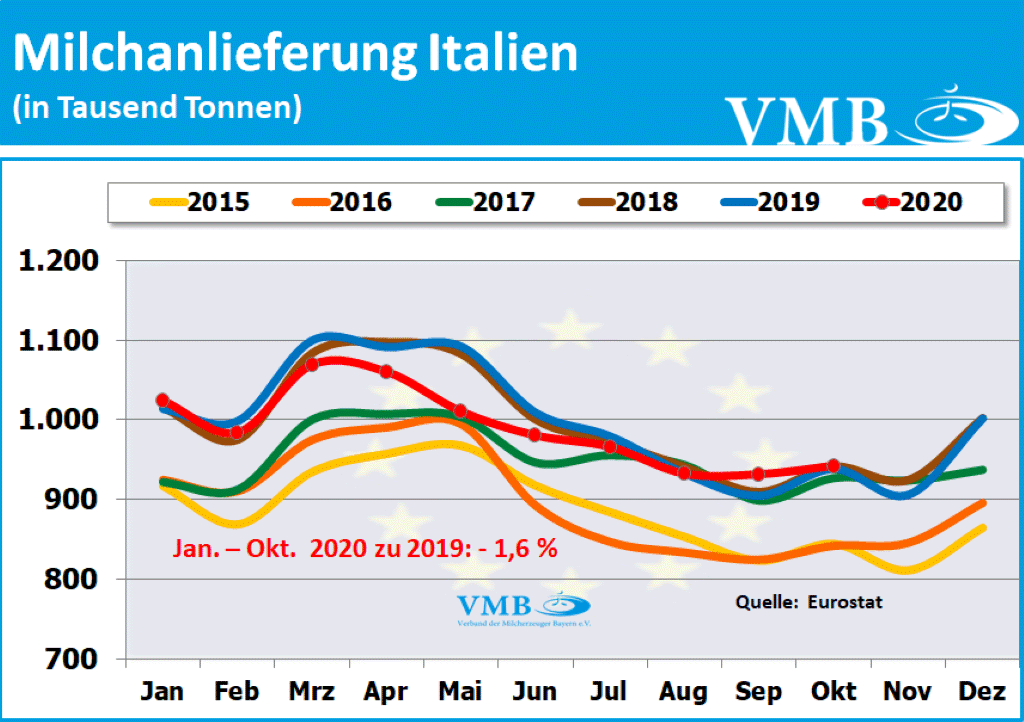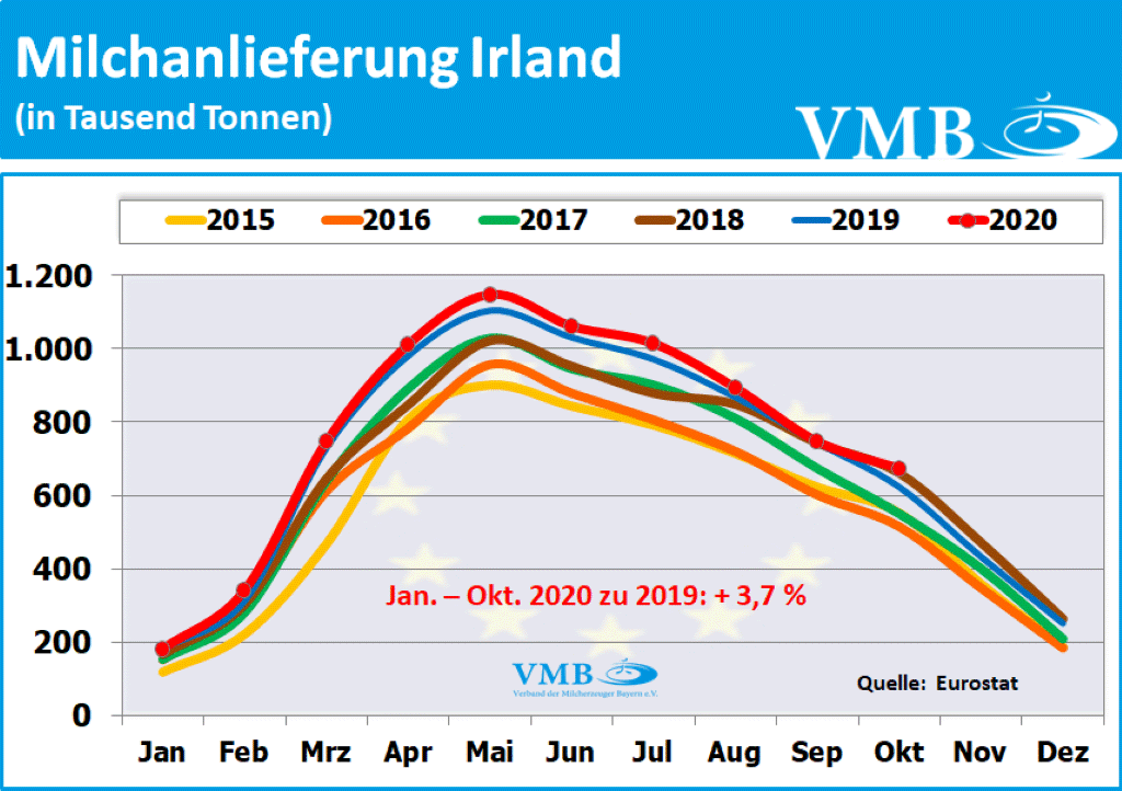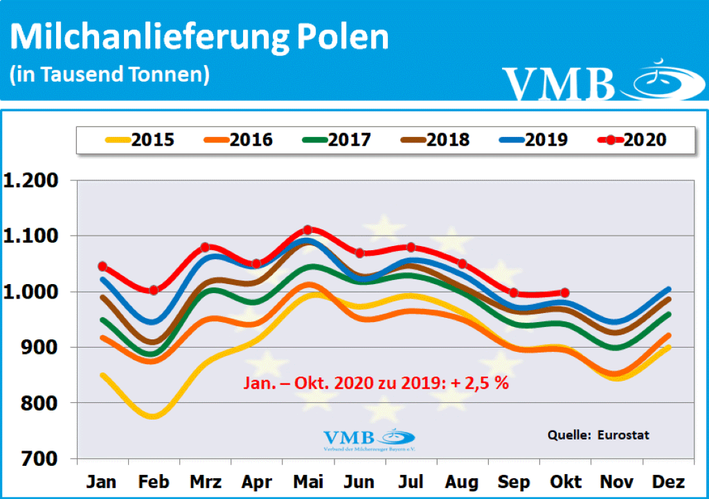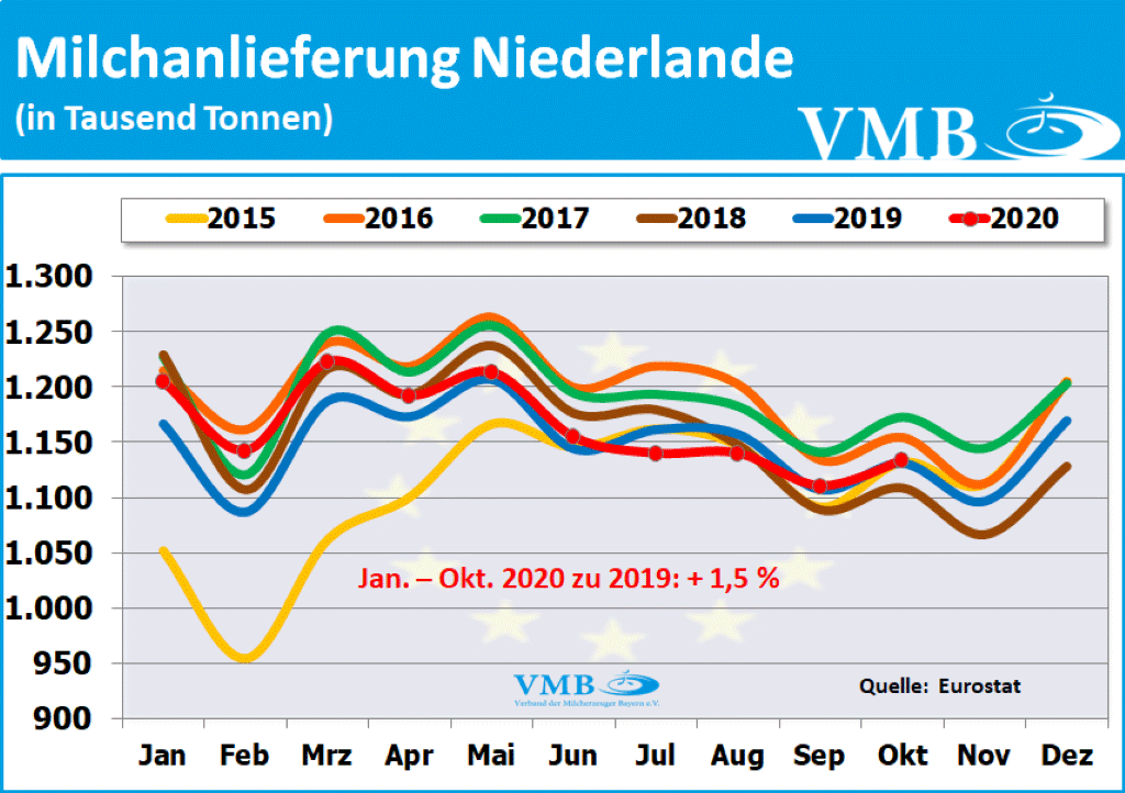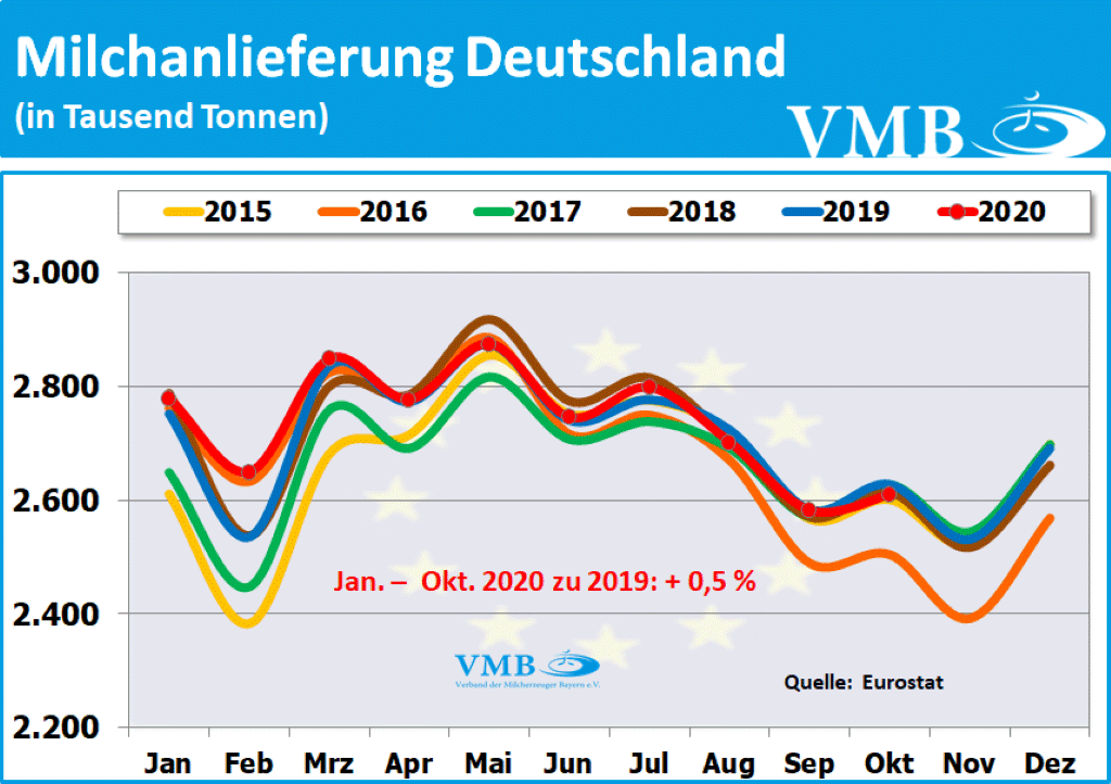 Der Anstieg der monatlichen europäischen Milchanlieferungen hat sich weiter um bzw. auf die Ein-Prozent-Marke eingependelt. Die Milcherzeuger vieler EU-Staaten liefern permanent über den Vorjahreswerten an und füllen dementsprechend die kumulierte Jahressumme auf. Im Oktober 2020 hat sich allerdings das Wachstum der Milchmenge mit einem Plus von 1,0 Prozent etwas reduziert, so dass der Abstand gegenüber dem Vorjahresmonat etwas geringer ausgefallen ist, als noch im Monat September 2020 mit einem Plus von 1,3 Prozent.