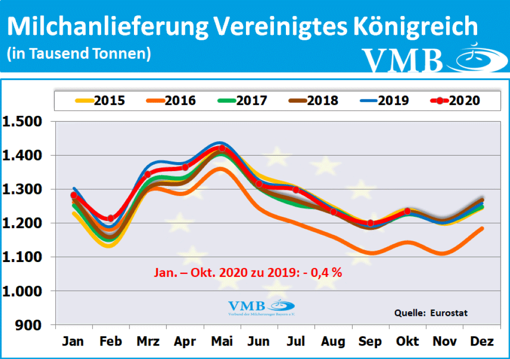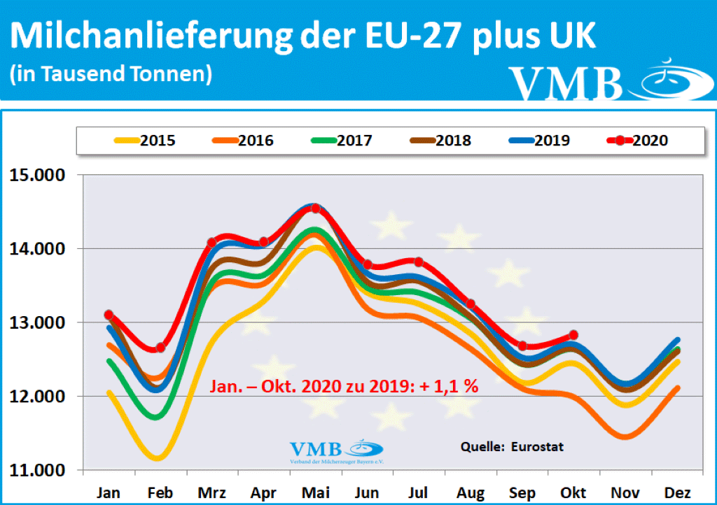 Das statistische Amt der Europäischen Union, kurz Eurostat genannt hat die Milcherzeugungsmenge der 27 EU-Staaten, einschließlich der Menge des Vereinigten Königreichs (United Kingdom), veröffentlicht. Demnach wurden in den EU-Staaten im Monat Oktober 2020 insgesamt 12,826 Milliarden Kilogramm Milch produziert. Verglichen mit den Ergebnissen des Vorjahresmonates ergibt sich eine Mehrmenge in Höhe von 123 Millionen Kilogramm. Demzufolge hat sich die europäische Milcherzeugung um ein Prozent erhöht. Die Gesamtsumme der Milchabgaben der ersten zehn Monate 2020 weist ein Plus von 1,1 Prozent auf. Hierdurch errechnet sich eine Gesamtanlieferungshöhe von 134,8 Milliarden Kilogramm. Im Vergleich zum vergangenen Jahr 2019, ist damit die vorläufige europäische Gesamtmilcherzeugung um über 1,5 Milliarden Kilogramm angestiegen. Da sich die Monatsabstände größtenteils um die Ein-Prozent-Marke bewegen, ist anzunehmen, dass die europäische Milchanlieferung in ihrer Jahressumme knapp die 160 Milliarden Kilogramm Milch erreichen könnte.