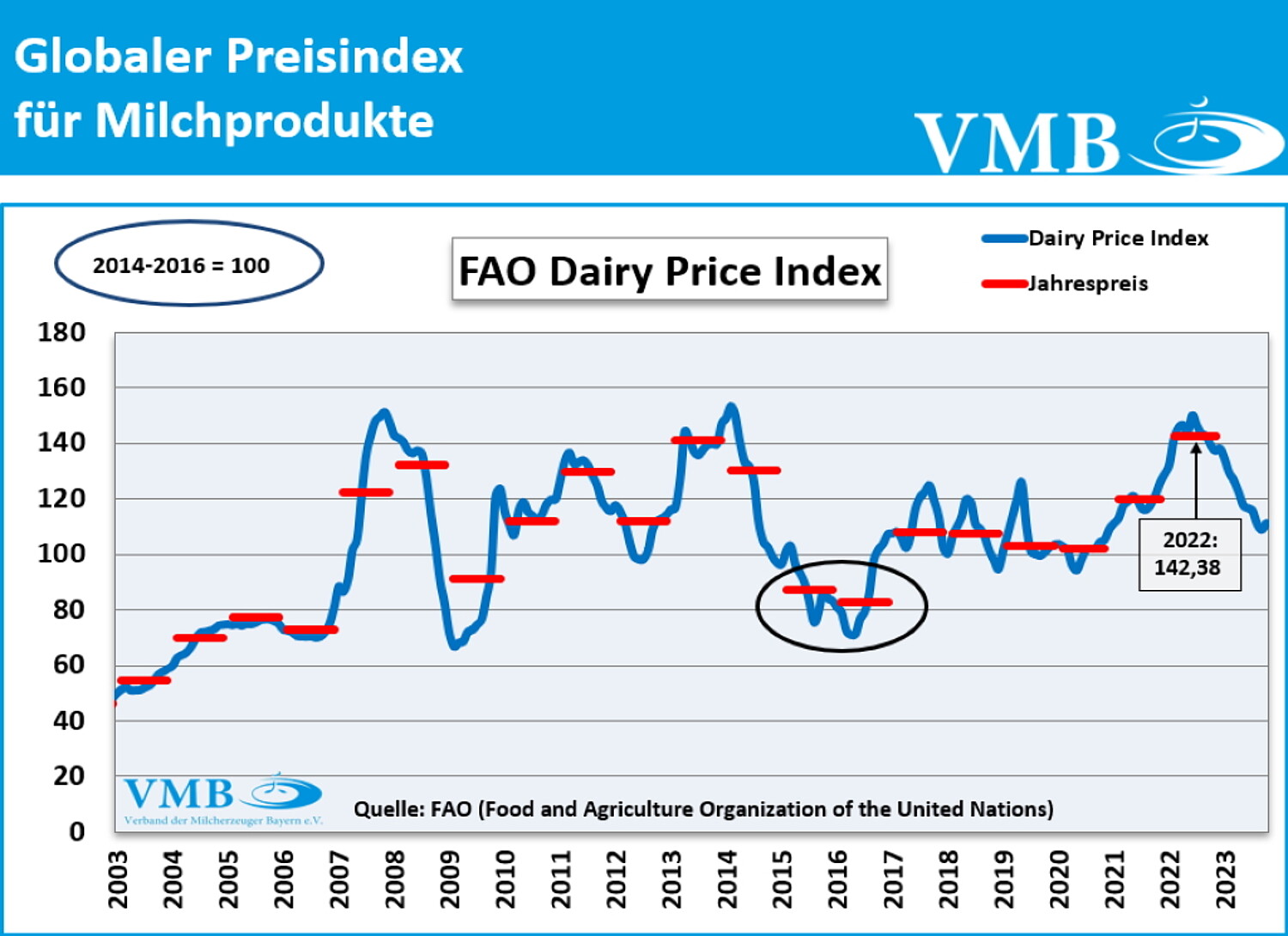 Die FAO – Food and Agriculture Organization of the United Nations, das heißt die agrarwirtschaftliche Organisation der Vereinten Nationen, analysiert auf den Weltmärkten über die Börsen die Preisentwicklung von landwirtschaftlichen Produkten und weist die Preistendenzen in der Gegenüberstellung zu den Vorjahren aus. Die Index-Berechnungsgrundlage beträgt 100 Punkte, dabei werden die durchschnittlichen Preise aus den Jahren 2014 bis 2016 (zuvor: Indexberechnungsgrundlage bis zum Jahr 2019: Durchschnitt von 2002 bis 2004) zugrunde gelegt. Auch werden einzelne Bereiche landwirtschaftlicher Erzeugnisse aus fünf Warengruppen, zusätzlich zum Gesamtdurchschnitt aller landwirtschaftlichen Produkte, aufgeführt. Nicht nur die Welthandelspreise von Milchprodukten, sondern auch die Zahlen von Getreide, Öle und Fette, Fleisch und Zucker werden als Indexwert bekanntgegeben.