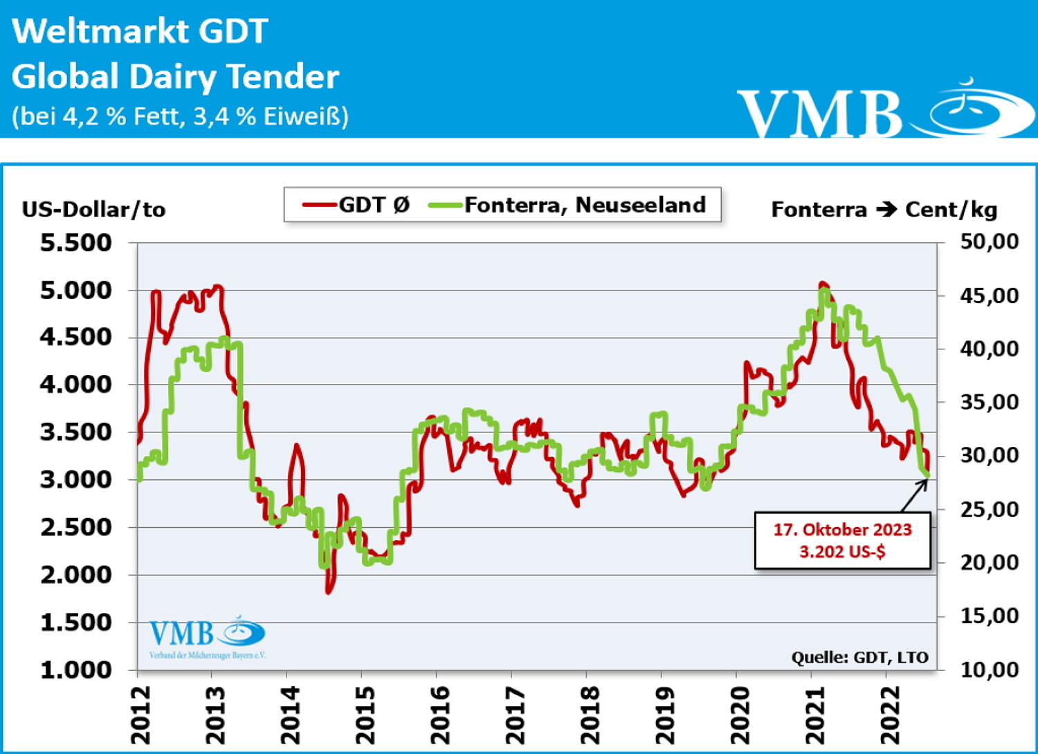 Für 2022 konnte der FAO-Index mit einem Durchschnitt von 142,4 Punkten den höchsten Wert seit über einem Jahres einnehmen. Ab dem Herbst 2022 fiel allerdings der Weltmilch-Index und setzte diese Talfahrt auch für heuer weiter fort. Dem Berechnungsindex liegen bekanntlich die Verwertungen für Agrarprodukte zu Grunde. Die internationalen Handelspreise für Milcherzeugnisse konnten ihren Höhenflug des Vorjahres nicht halten, da die guten Verkaufspreise sich viele Verbraucher nicht auf Dauer leisten konnten und auch noch die Corona Pandemie in China und der kriegerische Konflikt von Russland und der Ukraine die weltweiten Handelsgeschäfte teilweise massiv negativ veränderten. Dieser Einfluss hielt sich das ganze Jahr über, sodass die Verkaufspreise in Europa und global stetig unter Druck gerieten. Erst bei den letzten Auktionen des GDT-Tenders wendete sich das Blatt und die Verkaufspreise für Milcherzeugnisse konnten allmählich wieder punkten. Dabei gewannen im Trend die Milchpulvergeschäfte, aber auch die Preise bei Milchfett und Käse. Nach diesen Marktveränderungen konnte zum Herbst 2023 auch der FAO-Indexwert erstmals eine verbesserte Richtung vorlegen und erzielte ein Plus von 2,4 Punkten auf 111,3 Punkten. Somit ergibt sich ein vorläufiger Durchschnittswert von knapp 120. Damit befindet sich der Mittelwert um aktuell gut zwanzig Punkten unter dem Vorjahreswert, aber wahrscheinlich um zwanzig Punkte über dem marktgeschwächten Coronajahr 2020. Auch wenn die beiden letzten FAO-Ergebnisse nochmals anziehen werden, bleibt der Trend für 2023 bei einem Jahreswert um annähernd 120.