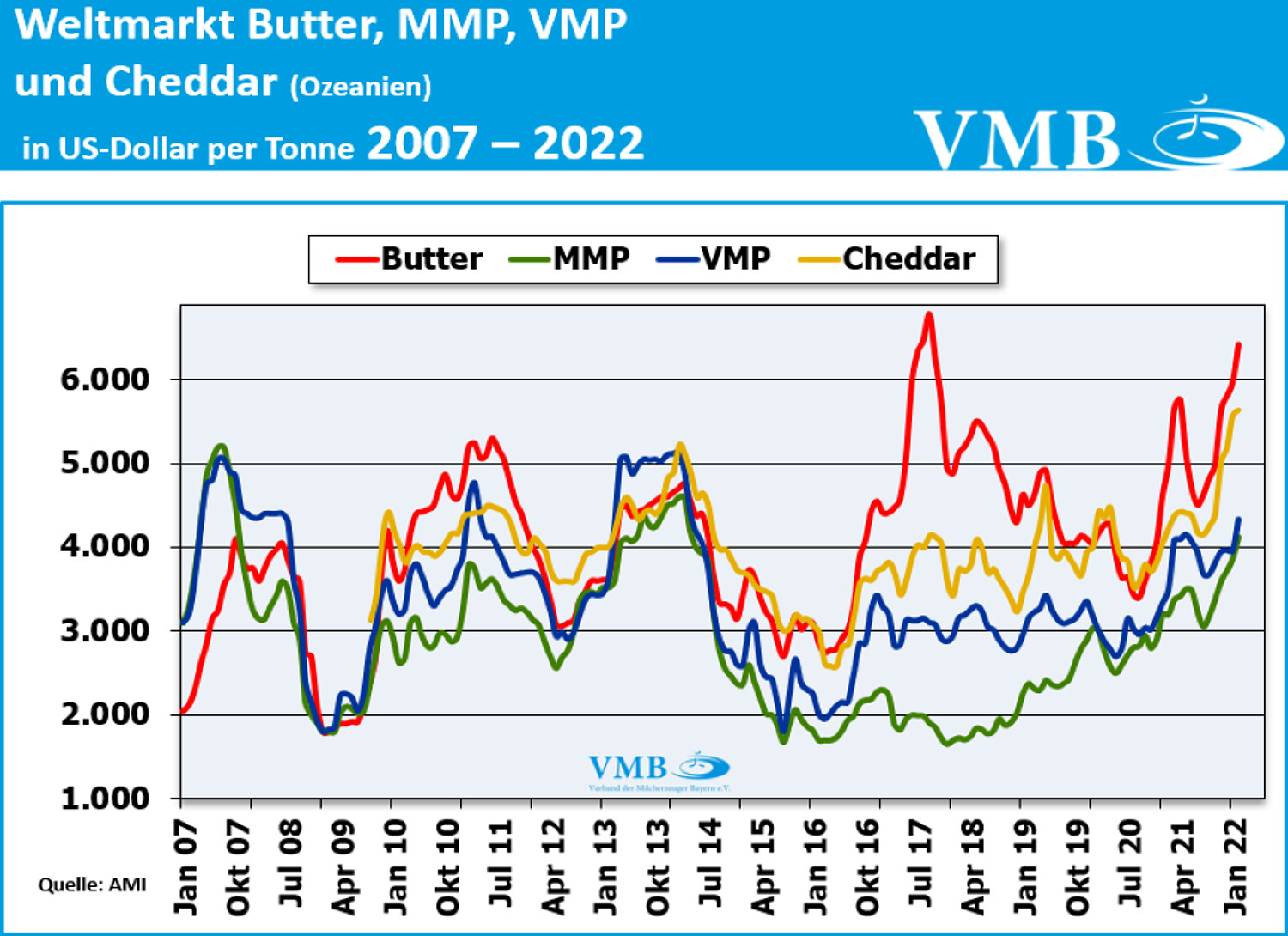 Gleich zu Jahresbeginn 2022 schritt, mitunter turbulent bei einigen Milchprodukten, die internationale Milchvermarktung voran. Die globalen Handelspreise für alle wichtigen Agrarerzeugnisse signalisieren gleichfalls diesen Trend. Zum Beispiel hat der Durchschnittswert der internationalen Handelsplattform des Global Dairy Trade-Tender (GDT) seit Jahresbeginn im Schnitt pro Auktion um gut 200 US-Dollar je Tonne zulegen können. Durch die derzeitigen kriegerischen Auseinandersetzungen und politischen Uneinigkeiten sind die nationalen sowie die internationalen Agrarmärkte preislich sehr heftig in Bewegung geraten. Es ist daher durchaus möglich, dass die FAO-INDEX-Werte in den kommenden Monaten noch weiterwachsen.