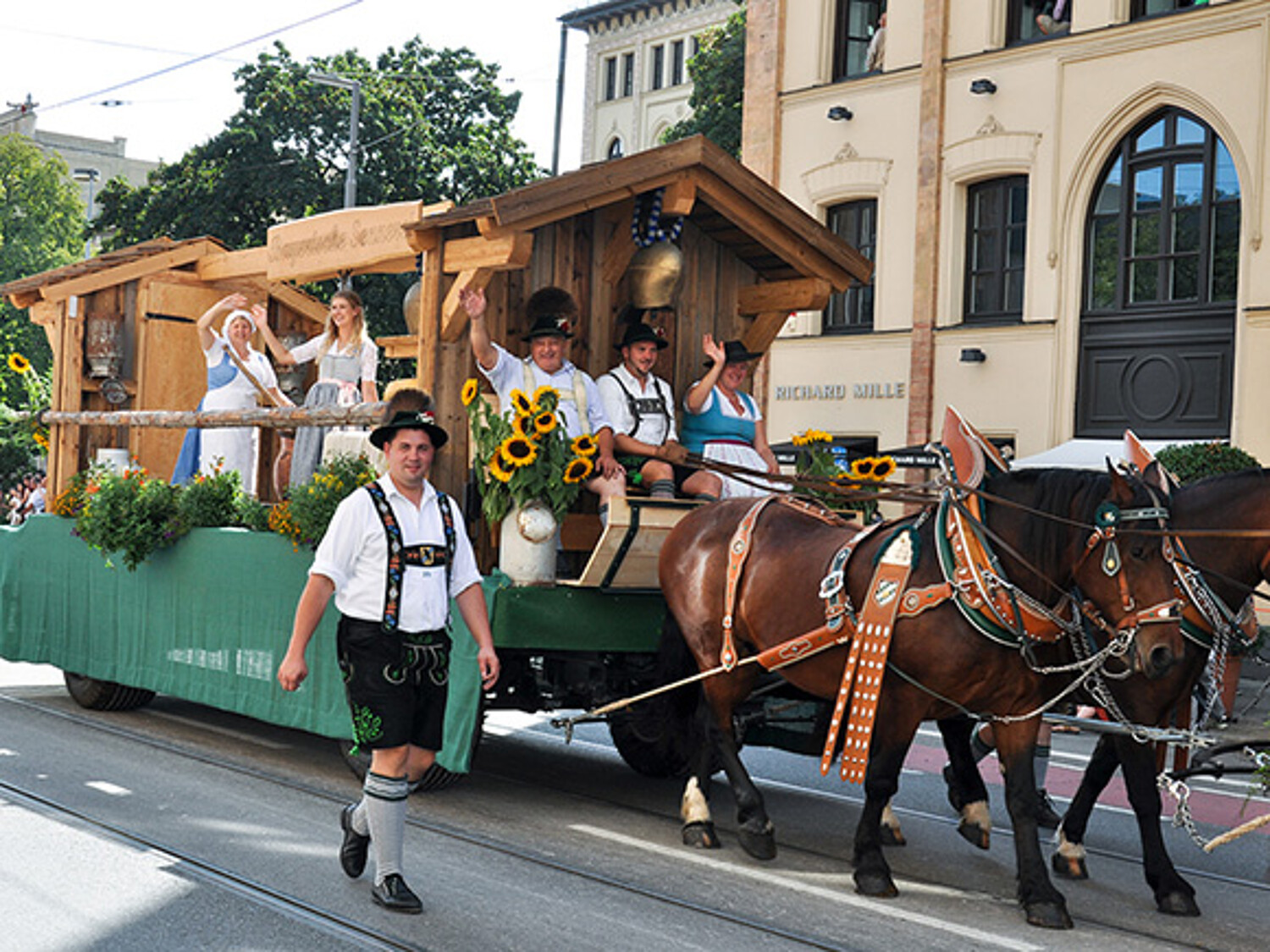 Beim Trachten- und Schützenzug vom Max II Monument durch die Innenstadt zogen am vergangenen Wiesn-Sonntag etwa 9.500 TeilnehmerInnen von Trachten- und Schützenvereinen, Musikkapellen und Spielmannszügen aus Bayern und angrenzenden Ländern wie Österreich, Südtirol, Italien, der Schweiz, Kroatien, Siebenbürgen und Serbien auf die Theresienwiese. Für die musikalische Unterhaltung sorgten zahlreiche Musikkapellen mit Volksmusik und traditionellen Märschen. Begleitet wurden sie von den prächtigen Pferdegespannen der Münchner Brauereien und mehr als 40 festlich geschmückte Festwägen und Kutschen, auf denen traditionelles Handwerk und bayerisches Brauchtum gezeigt wurde. Mit dabei auch die Molkereiwirtschaft. Gemeinsam organisiert von milch.bayern e.V. und dem Milchwirtschaftlichen Verein Bayern e.V. wurde auf dem Festwagen „Bayerische Sennerei“ die traditionelle Herstellung von Allgäuer Emmentaler und Bergkäse mit dem Kupferkessel gezeigt. Mit dabei als „Sennerin“ die Bayerische Milchkönigin Veronika Gschoßmann. Bei Bilderbuchwetter säumten tausende Schaulustige den sieben Kilometer langen Trachtenzug zur Theresienwiese.
