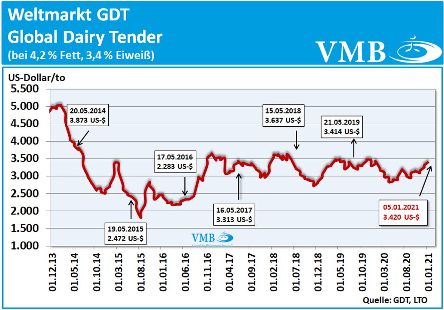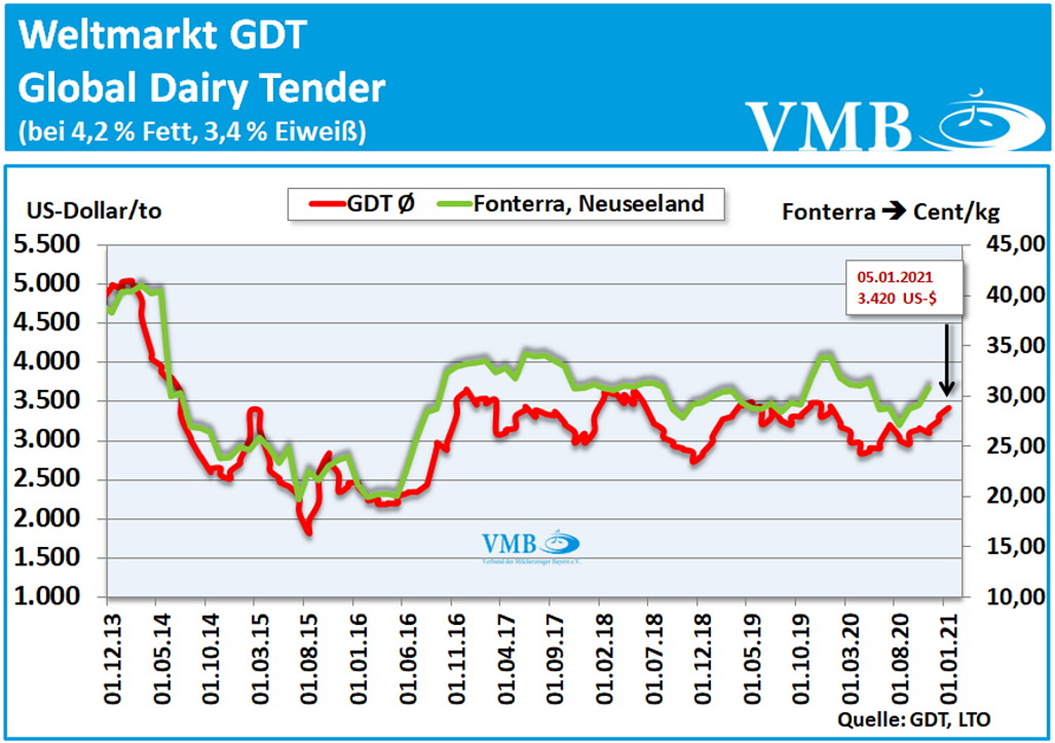 Das aktuelle Handelsergebnis des Global Dairy Trade Tenders (GDT) vom 05. Januar 2021 konnte sich gegenüber der vorangegangenen Auktion nochmals verbessern. Der Durchschnittspreis der Mischtonne (aus den Verkaufserlösen von Milchfett, Milchpulver und Käse) erzielte einen Wert in Höhe von 3.420 US-Dollar. Die vorherige und letzte Auktion Mitte Dezember 2020 hat einen Mischpreis von 3.317 US-Dollar pro Tonne erzielt. Dies ergibt eine Verbesserung von über 100 US-Dollar und somit eine Steigerung von 3,1 Prozent. Somit liegt das jetzt erzielte Ergebnis fast wieder auf der Höhe des Wertes wie zum Jahresanfang 2020. Der Durchschnittpreis der Mischtonne von allen gehandelten Milchprodukten ergibt für das Jahr 2020 einen Wert von 3.099 US-Dollar pro Tonne.