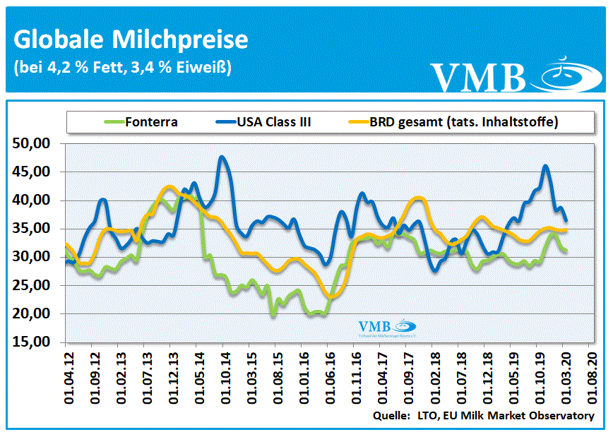 Durch die staatlichen Vorgaben seit Beginn der Corona-Krise, ist der Durchschnittswert des Global Dairy Tender von 3.371 $ pro Tonne (Auktionstag 07. Januar 2020) auf 2.836 $ pro Tonne (Auktionstag 21. April 2020) gesunken. Das ist ein Rückgang innerhalb drei Monaten von über 18 Prozent. Die letzte Auktion gibt zwar Hoffnung auf Stabilität im Absatz von Milchprodukten, trotzdem leiden noch viele Staaten an den wirtschaftlichen Auswirkungen des Lockdown. Auch die marktbestimmte Kaufkraft vieler erdölexportierender Staaten hat noch nicht das gewünschte Potential einnehmen können. Das Barrel Rohöl tendiert seit gut vier Wochen zwischen 20 bis 25 Dollar und liegt noch weit entfernt von den Handelspreisen Anfang diesen Jahres von über 60 Dollar.