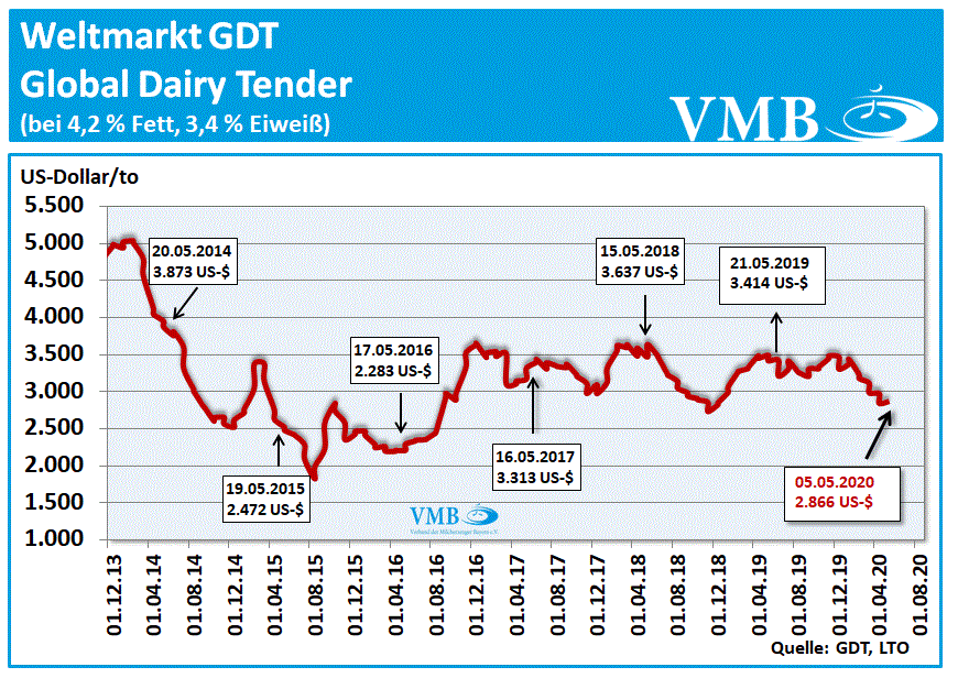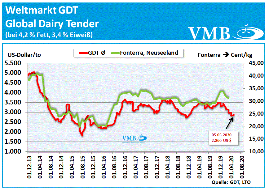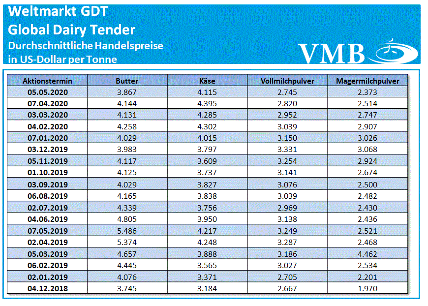 Die Handelsergebnisse des Global Dairy Tenders vom 05. Mai 2020 zeigen eine leichte Beruhigung des Marktes, wobei Milchpulver fest blieb, Milchfett und Käse nochmals an Position verloren haben. Der Durchschnittspreis der sogenannten Mischtonne aus den Verkaufserlösen von Milchfett, Milchpulver und Käse zeigt nun einen leicht erhöhten Wert von 2.866 $ pro Tonne. Bei der Auktion am 21. April 2020 erzielten die Produkte noch einen Wert von 2.836 $ pro Tonne. Dies ist ein Anstieg von 30 Dollar bzw. ein Plus von 1,0 Prozent.