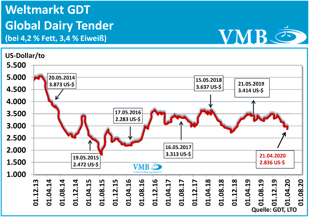 Die Handelsergebnisse des Global Dairy Tenders vom 21. April 2020 zeigen in fast allen Milchproduktsegmenten einen Rückgang der Preise an. Der Durchschnittspreis der sogenannten Mischtonne aus den Verkaufserlösen von Milchfett, Milchpulver und Käse zeigt nun einen Wert von 2.836 $ pro Tonne. In der vorherigen Auktion am 07. April 2020 erzielten die Produkte noch einen Wert von 2.969 $ pro Tonne. Dies bedeutet somit eine Minderung von 4,5 Prozent.