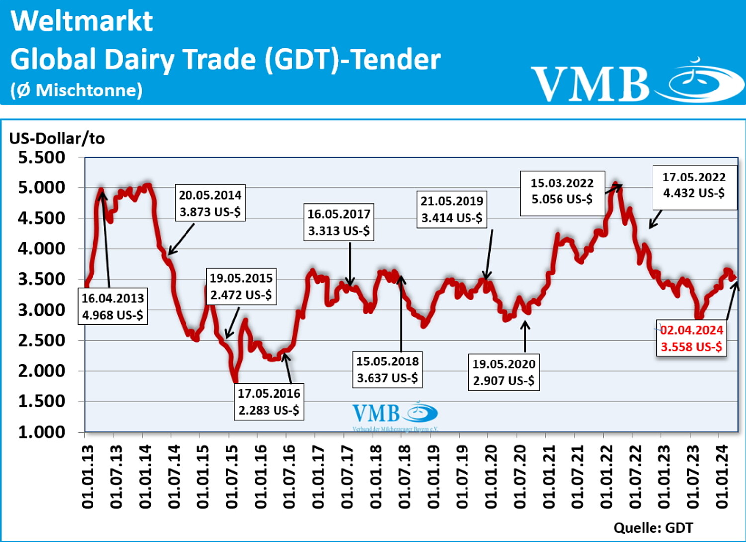 Zu Beginn des zweiten Quartals entwickelte sich der Index für eine Mischtonne wieder etwas freundlicher. Im März hatten die Auktionen des Global Dairy Trade Tenders in Neuseeland zweimal in Folge nachgegeben. Zum Ende des aktuellen Events konnten sich die Kurse stabilisieren und legten um durchschnittlich 1,7 % auf 3.558 US-Dollar zu. Das bisherige Jahreshoch wurde im Februar bei rund 3.660 US-Dollar erreicht. Vor allem die Kurse für Käse, Butter und Milchpulver drehten stärker ins Plus. Wenngleich das Interesse von Bieterseite etwas hinzugewonnen hatte, bewegte sich der Mengenumsatz mit 18.737 Tonnen auf einem derzeitigen Jahrestief.