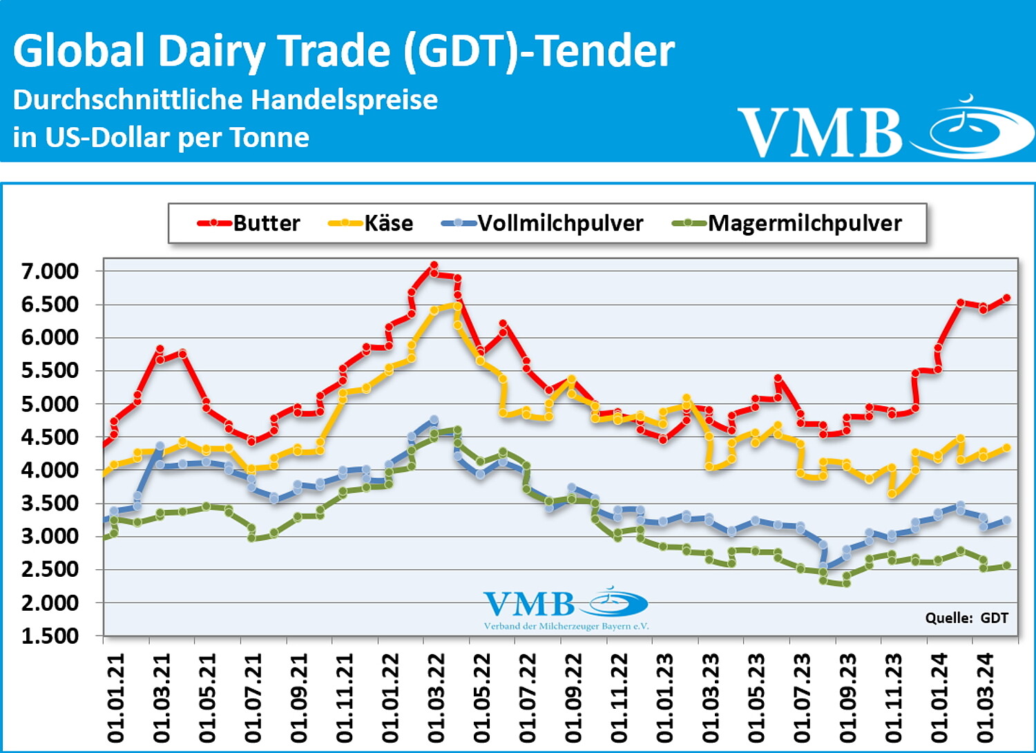 Das größte Kaufinteresse hatten die Bieter im Bereich des Vollmilchpulvers. Seit Ende Februar verloren die Kurse stetig und markierten im vergangenen Monat bei 3.143 US-Dollar das bisherige Jahrestief. Im aktuellen April-Event wurde Vollmilchpulver bei durchschnittlich 3.246 US-Dollar gehandelt und kostete 3,3 % mehr als im März. Für spätere Terminkontrakte z. B. Juni/Juli tendierten die Kurse ebenfalls fester.