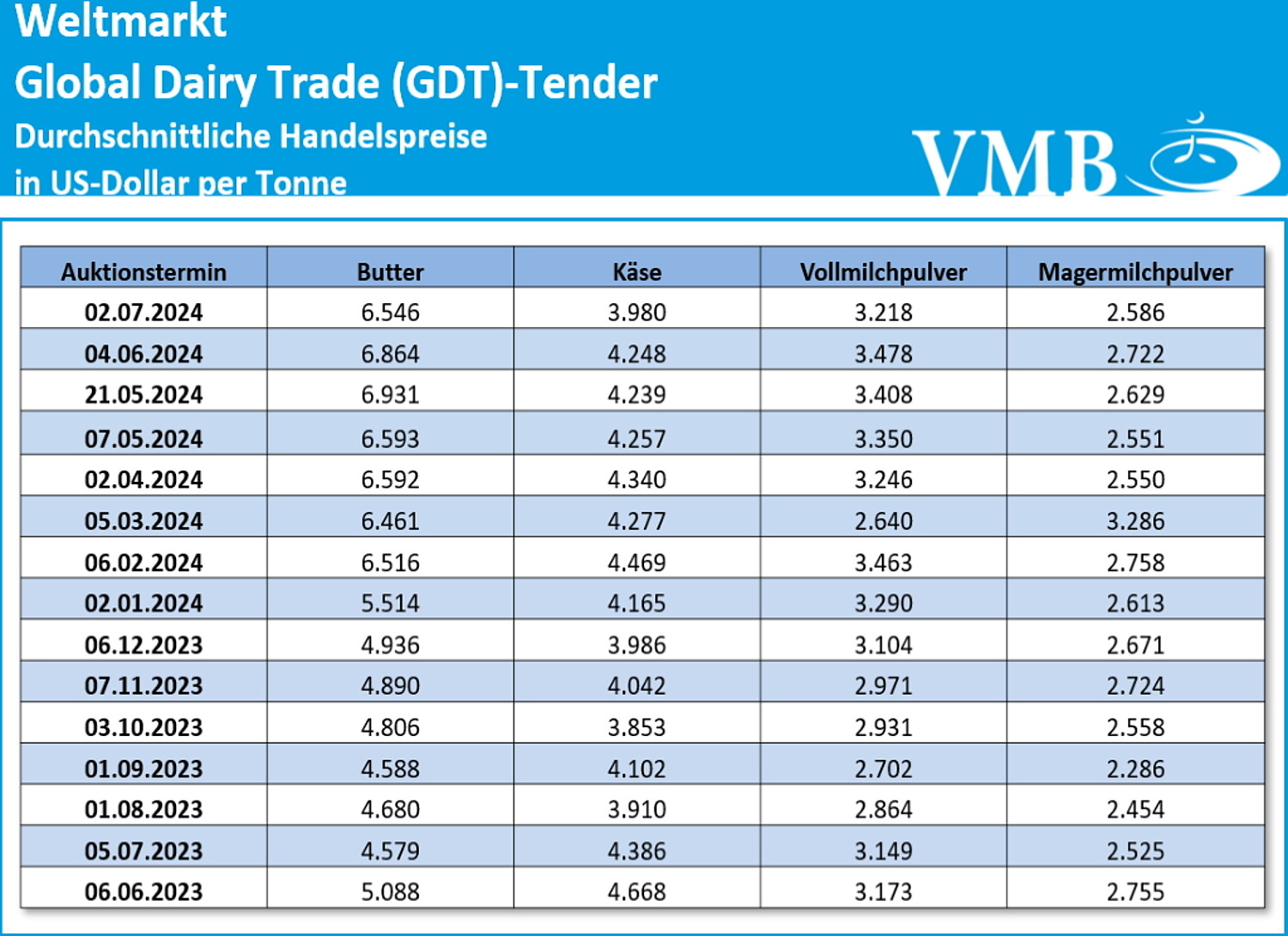 Bei der ersten Auktion im Juli sind die Kurse des Global Dairy Trade-Tender in Neuseeland über nahezu alle gehandelten Milchprodukte unter Druck geraten. Der durchschnittliche Börsenwert für eine Mischtonne (Erlös aus Milchfett, Milchpulver und Käse) verlor, nach einer festen Kursentwicklung im Mai und Juni, im aktuellen Event um 111 US-Dollar bzw. 2,9 % gegenüber der letzten Veröffentlichung im Juni. Die gehandelte Menge erhöhte sich auf 24.138 t, ein Plus von rund 7.350 t. Die Zahl der teilnehmenden Bieter hat sich kaum verändert.