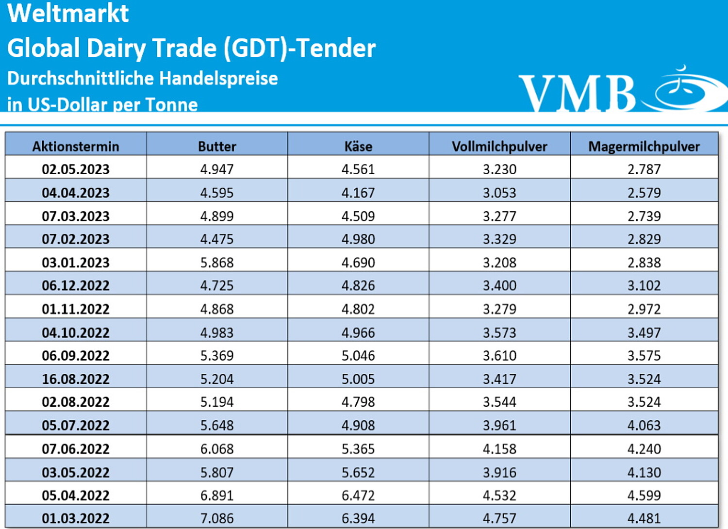 Bekanntlich hat der Sommer noch nicht begonnen, bis die erste (Rauch)Schwalbe hierzulande sichtbar wird. Aber in Bezug auf den GDT-Tender könnte man jetzt davon ausgehen, dass eine gewisse Festigung eingetreten ist. Die Rückgänge der letzten Auktionen waren sehr moderat und nun wurde bei den letzten beiden Verhandlungen ein Preisanstieg registriert. Damit scheint, dass nun, mit Plattformwert von 3.500 US-Dollar bei der Mischtonne der gehandelten Milcherzeugnisse, das Preistal durchschritten sein könnte.