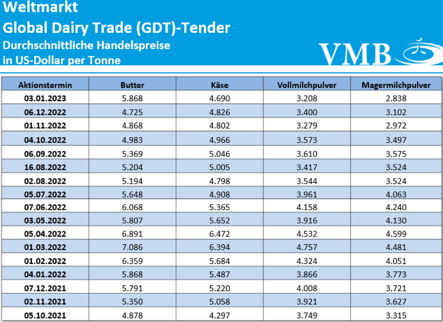 Zum Jahresstart zeigt sich das Handelsergebnis des GDT-Tenders noch sehr unentschlossen. Die Tendenz zum Jahresausklang 2022 setzt mit der ersten Auktion auch in diesem Jahr fort. Der erste Mittelwert von 3.365 US-Dollar je Mischtonne (Durchschnitt aus den Verkaufserlösen von Milchfett, Milchpulver und Käse) errechnet dabei einen Rückgang von 128 US-Dollar bzw. ein Minus zur vorherigen Auktion am 20. Dezember 2022 von 3,7 Prozent. Mit diesem Betrag befindet sich der Mittelwert wieder auf Höhe zu Beginn der ersten weltweiten Corona-Pandemie. Erfreulich an diesem Ergebnis ist das immense Handelsvolumen von über 33.000 Tonnen.
