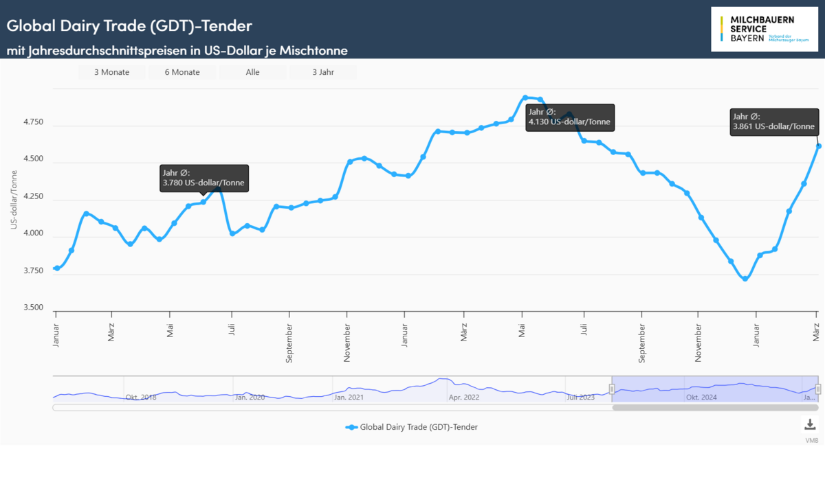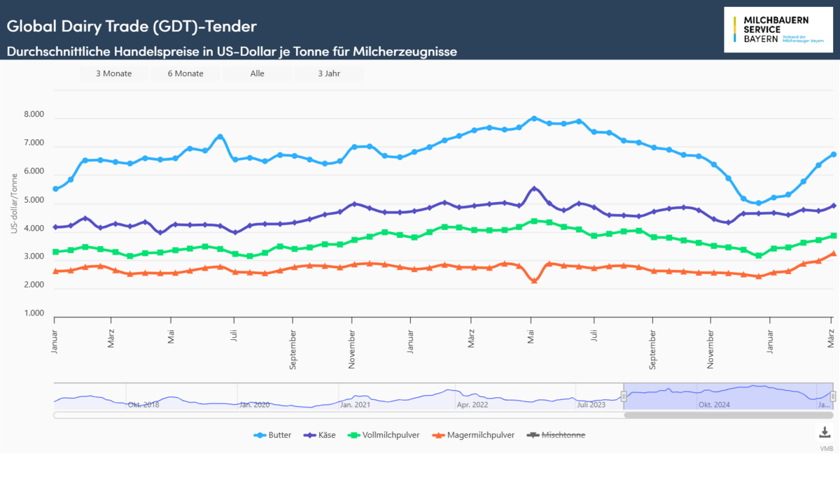 Im Handel mit Butter legten die Kurse auf 6.728 US-Dollar/t zu und erlösten um rund 380 US-Dollar oder 6,0 % mehr als Ende Februar. Seit Jahresbeginn konnten die Butterkurse einen außerordentlichen Anstieg von fast 30 % bzw. gut 1.500 US-Dollar/t hinlegen. Für wasserfreies Milchfett schlossen die Kurse zum Handelsende bei 7.147 US-Dollar/t, was ein Plus von 5,9 % oder 396 US-Dollar/t bedeutet.