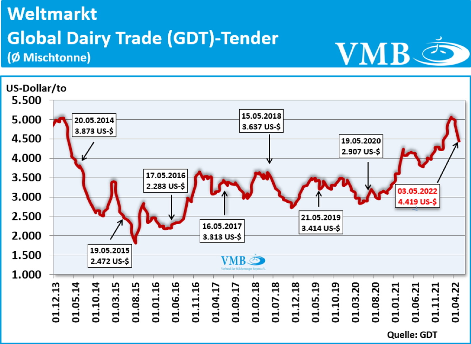 Die Auktion des GDT-Tenders vom 03. Mai 2022 konnte mit einem durchschnittlichen Handelspreis (Durchschnitt aus den Verkaufserlösen von Milchfett, Milchpulver und Käse) von 4.419 US-Dollar pro Mischtonne abschließen. Dies ist in diesem Jahr in Folge der vierte Rückgang beim Verkauf von Milchprodukten auf der internationalen Handelsplattform. Die Differenz gegenüber der Auktion vom 19.04.2022 beträgt nur 436 US-Dollar pro Tonne, das bedeutet einen Rückgang von fast neun Prozentpunkten. Mit diesem Wert befindet sich der GDT wieder auf der Höhe wie zu Jahresbeginn.