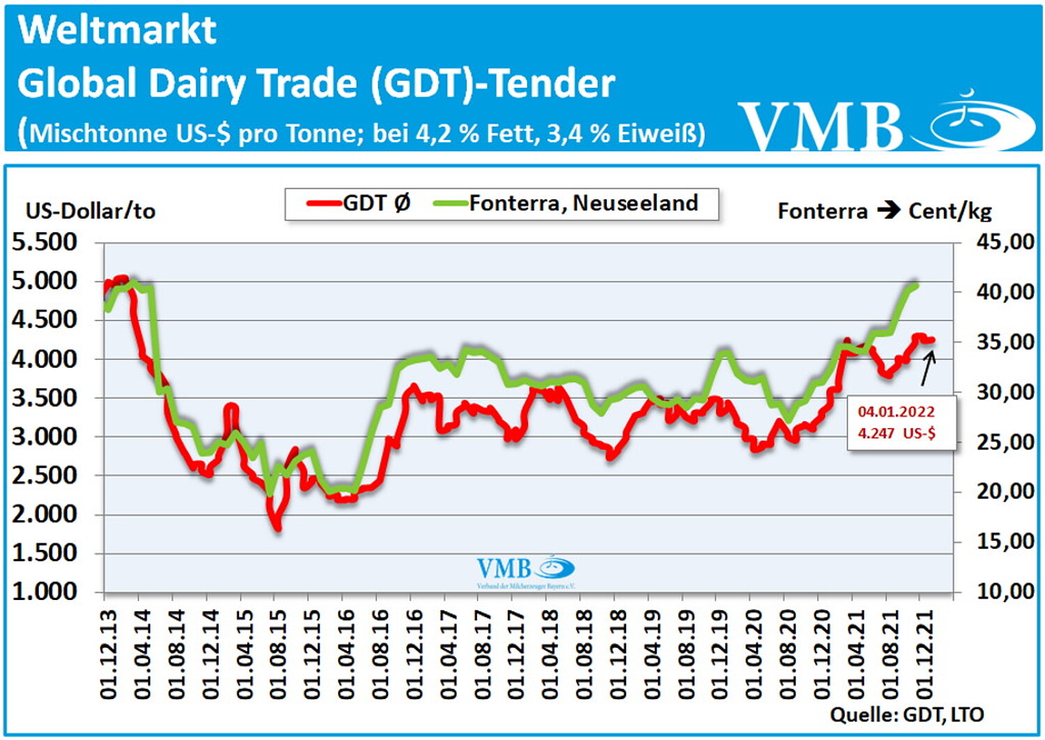 Das erste Ergebniss der Auktion des Global Dairy Trade im neuen Jahr verdeutlicht die derzeit feste und gute Marktstimmung für Milcherzeugnisse am Weltmarkt. Die Auktion des GDT-Tenders vom 04. Januar 2022 zeigt den durchschnittlichen Handelspreis (Durchschnitt aus den Verkaufserlösen von Milchfett, Milchpulver und Käse) von 4.247 US-Dollar pro Mischtonne. Das Ergebnis spiegelt das hohe und stabile Niveau mit leicht anziehender Tendenz im Vergleich zu den vorherigen Auktionen im Jahr 2021. Der Durchschnittspreis hat geringfügig um 11 US-Dollar pro Mischtonne angezogen. In Prozenten ausgedrückt, liegt der Abstand gegenüber der letzten Auktion vom 21. Dezember 2021 bei 0,2 Prozent.
