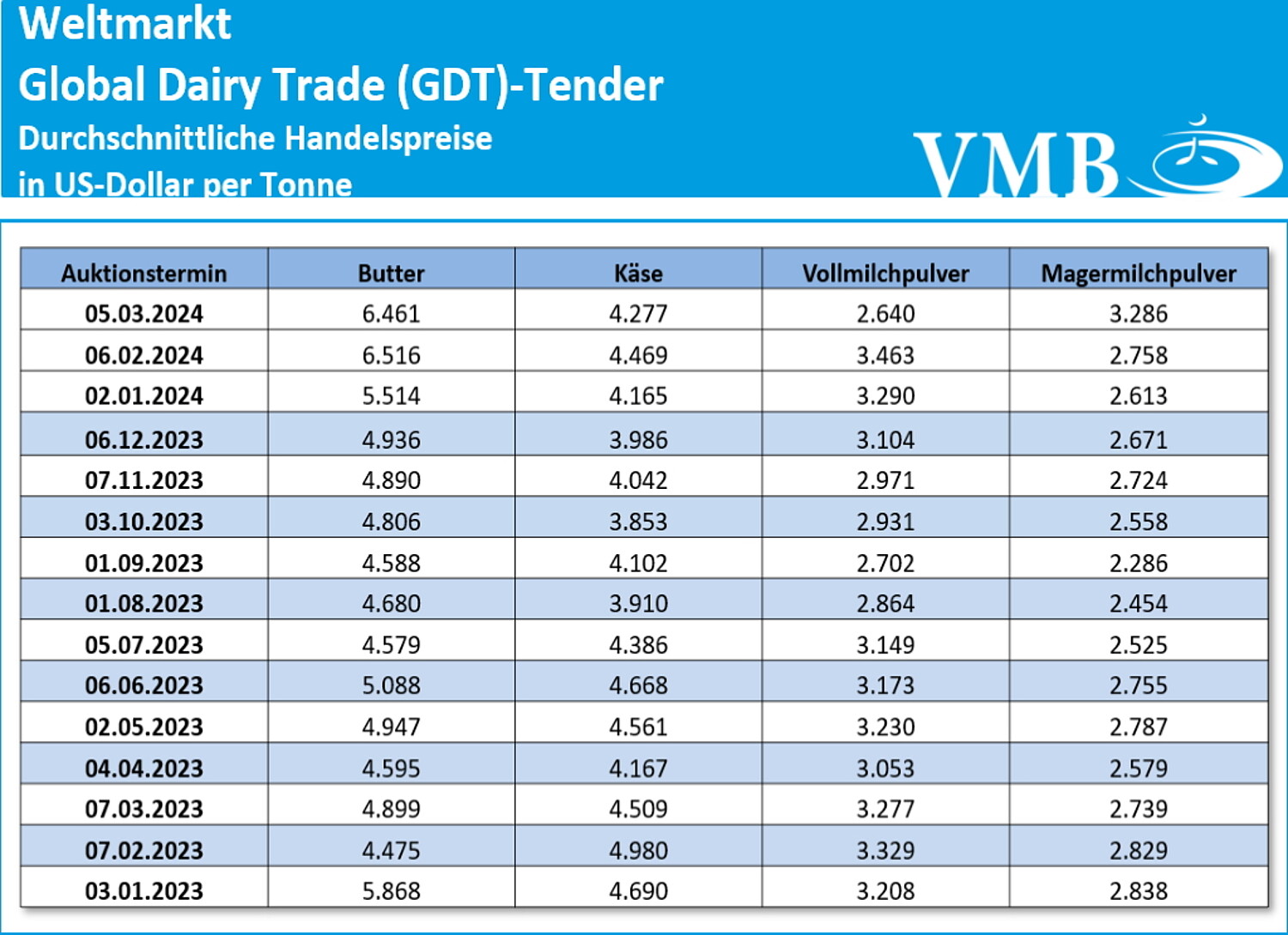 Der seit Jahresbeginn nach oben gerichtete Trend des GDT-Tenders wurde in der aktuellen Auktion Anfang März unterbrochen. Mit einem Durchschnittserlös von 3.630 US-Dollar schloss die Auktion in Neuseeland um 0,9 Prozent bzw. 34 US-Dollar niedriger als beim letzten Ergebnis im Februar. Das Handelsvolumen hatte trotz einer größeren Anzahl an Bietern auf 21.235 Tonnen (-12,6 %) abgenommen, was der kleinsten Handelsmenge im bisherigen Jahresverlauf entspricht. Schwächere Auktionsergebnisse bei Milchpulver haben die zuletzt freundliche Entwicklung am GDT-Preisindex gedämpft.