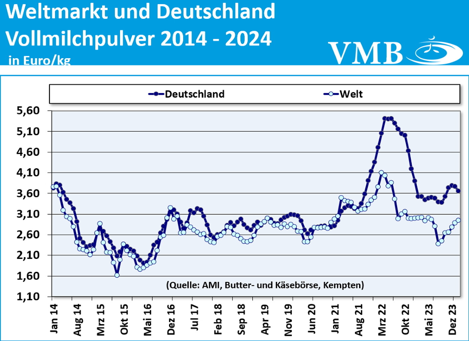 Für Vollmilchpulver hingegen entwickelten sich die Handelspreise in der zweiten Februarhälfte schwächer und hatten auch in der aktuellen Auktion nochmals verloren. Zum Börsenschluss lagen die Verkaufserlöse bei 3.286 US-Dollar und somit 3,0 Prozent unter dem zuletzt aufgerufenen Auktionspreis.