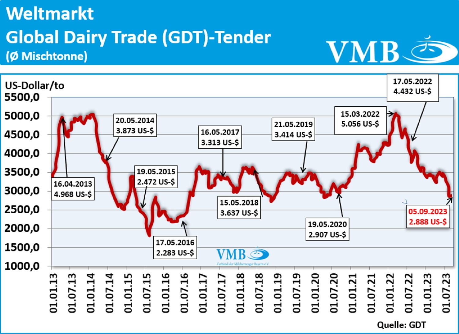 Mit dem achtzehnten Handelstermin vom 05. September 2023 hat der durchschnittliche Börsenwert des GDT-Tenders für Milcherzeugnisse seine seit mehreren Auktionen rückläufige Tendenz zwar gestoppt, aber eine Interpretation für die Entwicklung des internationalen Milchmarktes ist dabei mit den Auktionswert noch nicht möglich. Der aktuelle Durchschnittspreis hat sich fast auf dem Niveau wie zum vorherigen Ergebnis ergeben und bleibt daher vorerst unter der 3.000 US-Dollar-Linie. Die aktuelle Preisnotierung verzeichnet einen Mittelwert von 2.888 US-Dollar je Mischtonne (Durchschnitt aus den Verkaufserlösen von Milchfett, Milchpulver und Käse) und weist somit leichten Anstieg von 0,5 Prozent bzw. ein Plus von 13 US-Dollar zur Notierung vom 15. August 2023 auf. Das Handelsvolumen hat nochmals deutlich zugelegt mit einem Handelsvolumen von fast 38.000 Tonnen. Im ersten Halbjahr 2023 lagen die Verkaufsmengen an Milcherzeugnissen im Durchschnitt um 10 bis 15.000 Tonnen niedriger.