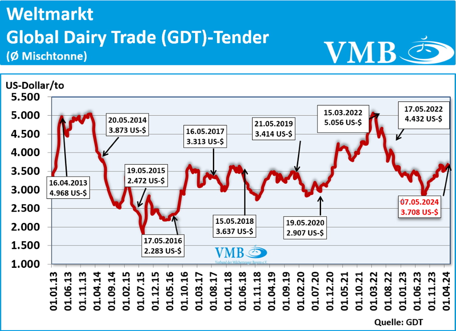 Beim ersten GDT-Event des Monats Mai nahmen die Kurse für Molkereiprodukte in Neuseeland in nahezu allen Produktbereichen eine freundliche Entwicklung. Der Preisindex für eine Mischtonne (Durchschnitt aus den Verkaufserlösen von Milchfett, Milchpulver und Käse) legten um 3,3 % gegenüber der letzten Veröffentlichung im April zu. Mit einem Durchschnittserlös von 3.708 US-Dollar erreichte der GDT-Tender im derzeitigen Jahresverlauf einen neuen Höchststand. Das bisherige Jahreshoch wurde am 20. Februar 2024 erreicht und lag bei 3.664 US-Dollar. Nach einer zuletzt rückläufigen Anzahl an Bietern wurden Anfang Mai wieder mehr Teilnehmer registriert. Auch die gehandelte Menge erhöhte sich um 1.577 t (+8,9 %) auf insgesamt 19.231 t.