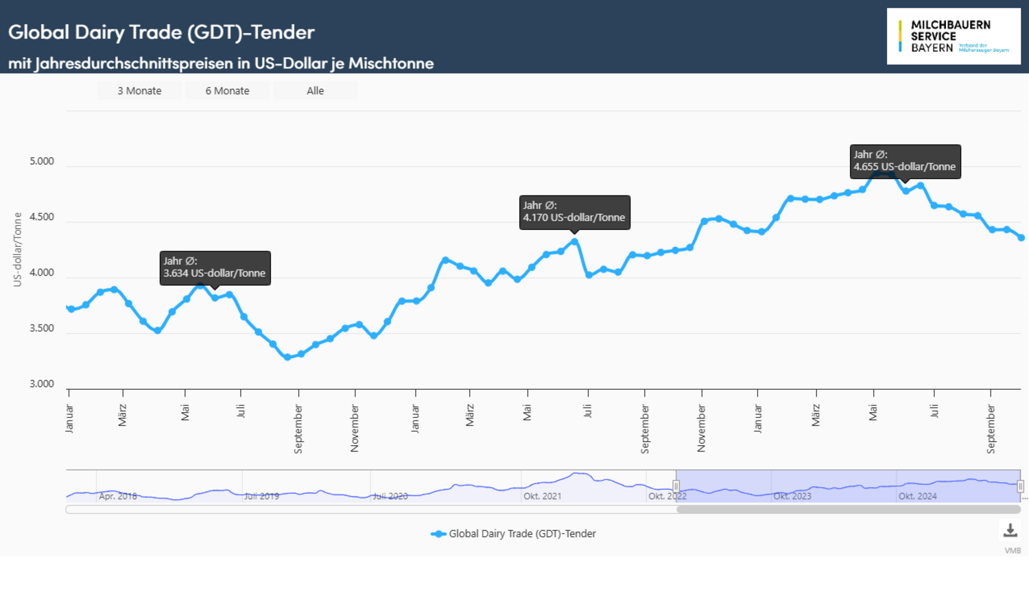 Die erste Auktion des Global Dairy Trade (GDT) im Oktober startete unter negativen Vorzeichen in den Monat. Hatten sich in der zweiten Septemberhälfte die Kurse vom Einbruch zuvor etwas stabilisieren können, folgte beim aktuellen Handelstermin vom 07. Oktober 2025 ein Rückgang von 3 % und die Kurse für eine Mischtonne (Durchschnitt aus den Verkaufserlösen von Milchfett, Milchpulver und Käse) unterschritten erstmals wieder die Marke von 4.000 US-Dollar. Mit einem durchschnittlichen Erlös von 3.921 US-Dollar näherten sich die Kurse wieder der Vorjahreslinie an und nahmen das niedrigste Niveau seit November 2024 ein. Behaupten konnten sich beim aktuellen Event lediglich die Verkaufserlöse für Käse und wasserfreies Milchfett (Butteröl). Das Handelsvolumen erreichte mit 42.013 Tonnen einen Jahreshöchstwert.