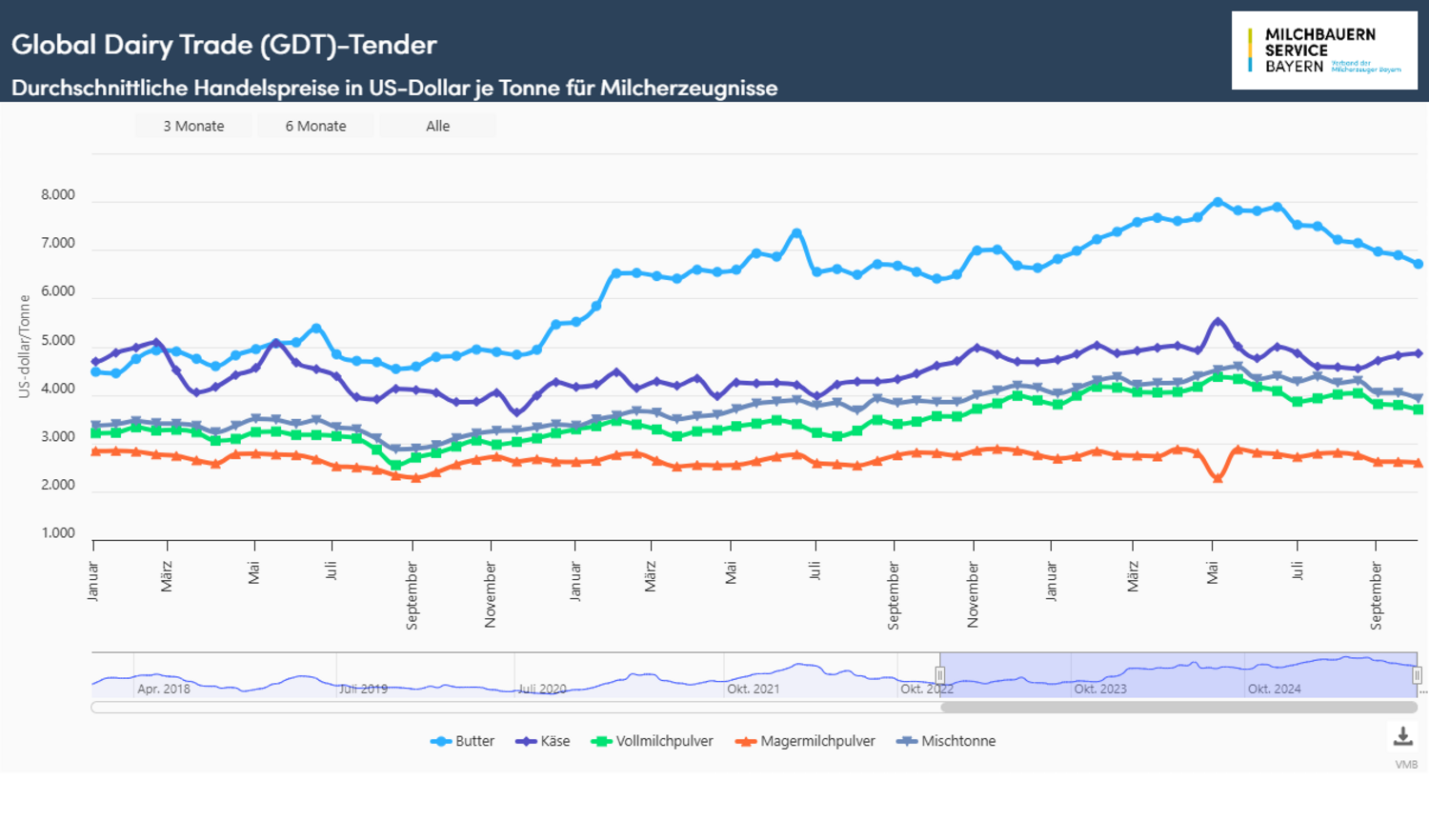 Die für den Welthandel mit Milchprodukten bedeutende Handelsplattform GDT in Neuseeland war zu Beginn des Oktobers hauptsächlich von rückläufigen Verkaufserlösen geprägt. Eine Ausnahme brachte der Handel mit Butteröl (Butterschmalz) und Käse. Die Kurse für Butteröl stabilisierten sich, nachdem im September ein rückläufiger Trend einsetzte. Mit einem Schlusskurs von 6.916 US-Dollar verbesserte sich der Verkaufserlös um 1,7 % zur letzten Auktion. Der Handel mit Käse verlief auf stabilem Niveau, ähnlich wie im September. Die Verkaufserlöse bewegten sich bei 4.858 US-Dollar knapp 1,0 % über dem letzten Ergebnis. Auf bisheriger Jahressicht haben die Käseerlöse an Höhe eingebüßt, der durchschnittliche Erlös errechnet sich in den ersten neun Monaten bei 4.870 US-Dollar und liegt dabei weiterhin über der Vorjahreslinie.