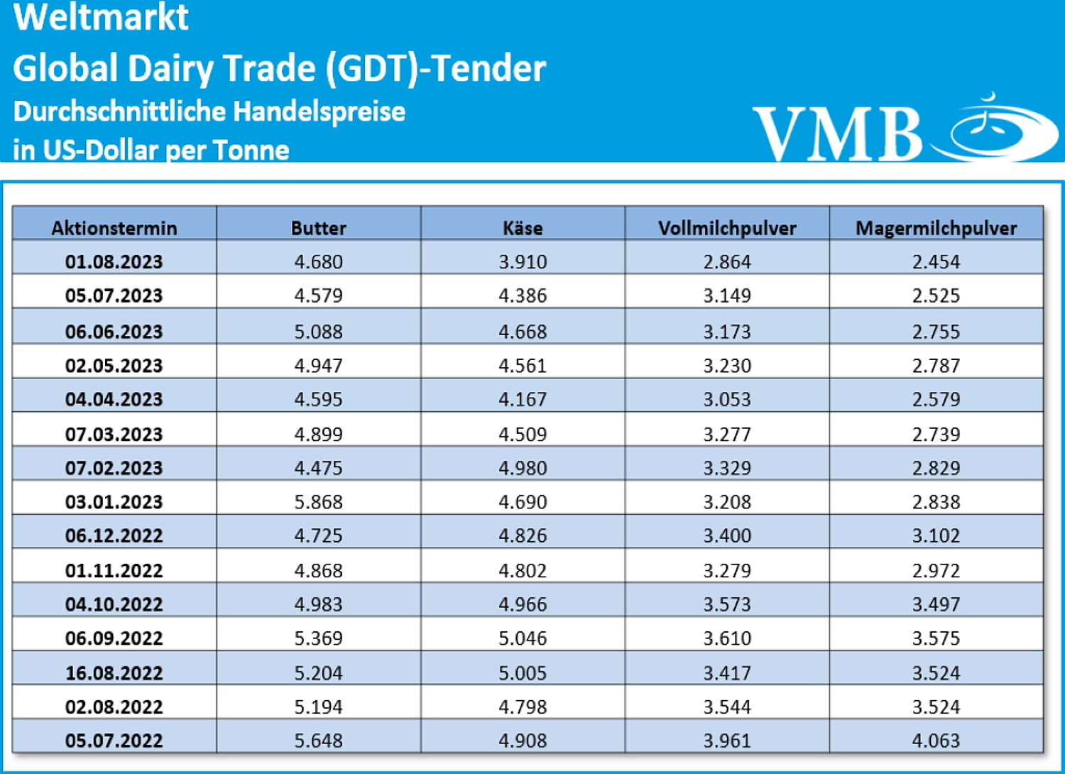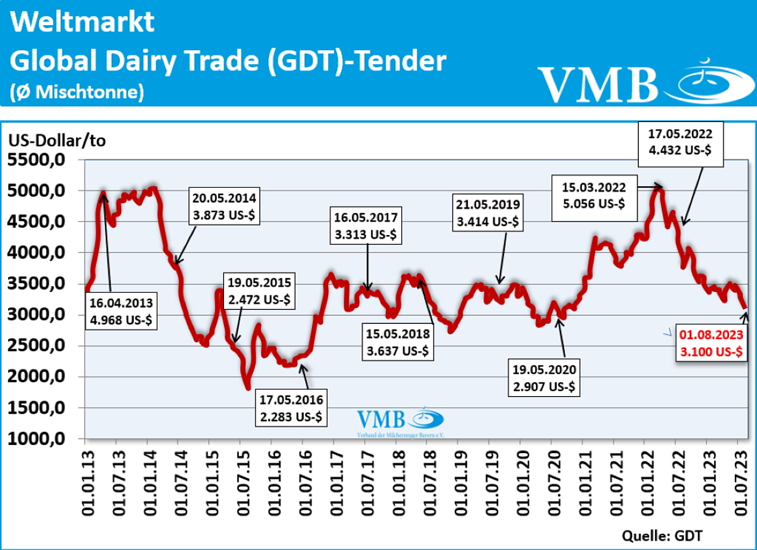 Mit dem sechzehnten Handelstermin hat der durchschnittliche Börsenwert des GDT-Tenders für Milcherzeugnisse wieder eine rückläufige Tendenz eingenommen. Zum dritten Mal in Folge fiel der Durchschnittspreis. Mit dem aktuellen Wert wurde der bisher niedrigste Stand für dieses Jahr erreicht. Die aktuelle Preisnotierung verzeichnet einen Mittelwert von 3.100 US-Dollar je Mischtonne (Durchschnitt aus den Verkaufserlösen von Milchfett, Milchpulver und Käse) und weist somit einen Rückgang von 5,7 Prozent bzw. 189 US-Dollar auf. Das Handelsvolumen hat sich verbessert, so dass fast 33.000 Tonnen an Milcherzeugnissen mehr abgesetzt werden konnten, eine Erhöhung um gut 7.000 Tonnen Commodities Molkereiprodukte.