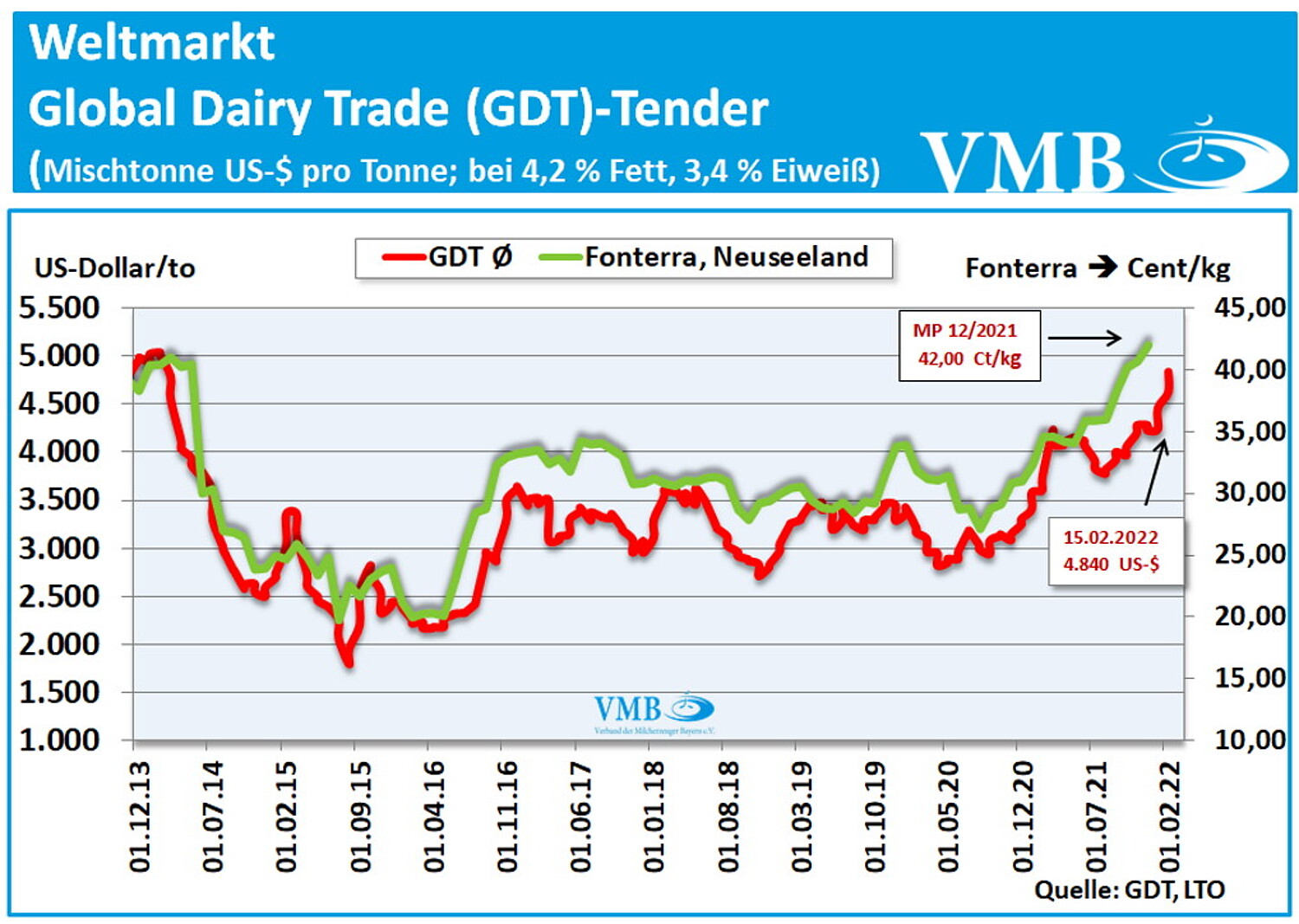 Der Global Dairy Trade hat auch bei der vierten Versteigerung in diesem Jahr einen weiteren Beweis des doch sehr festen globalen Milchmarktes gezeigt. Die Auktion des GDT-Tenders am 15. Februar 2022 konnte mit einem durchschnittlichen Handelspreis (Durchschnitt aus den Verkaufserlösen von Milchfett, Milchpulver und Käse) von 4.840 US-Dollar pro Mischtonne abschließen. Dies sind 210 US-Dollar mehr als beim vorherigen Börsengang am 01. Februar 2022. Prozentual ausgedrückt ist dies ein Plus von 4,5 Prozent. Seit dem Jahreswechsel zeigt der GDT-Tender einen Höhenflug mit einem Zuwachs von über 600 US-Dollar. Tendenziell fehlt nicht mehr viel um das Spitzenergebnis der Auktion vom 16. April 2013, mit 4.968 US-Dollar je Mischtonne, zu toppen.