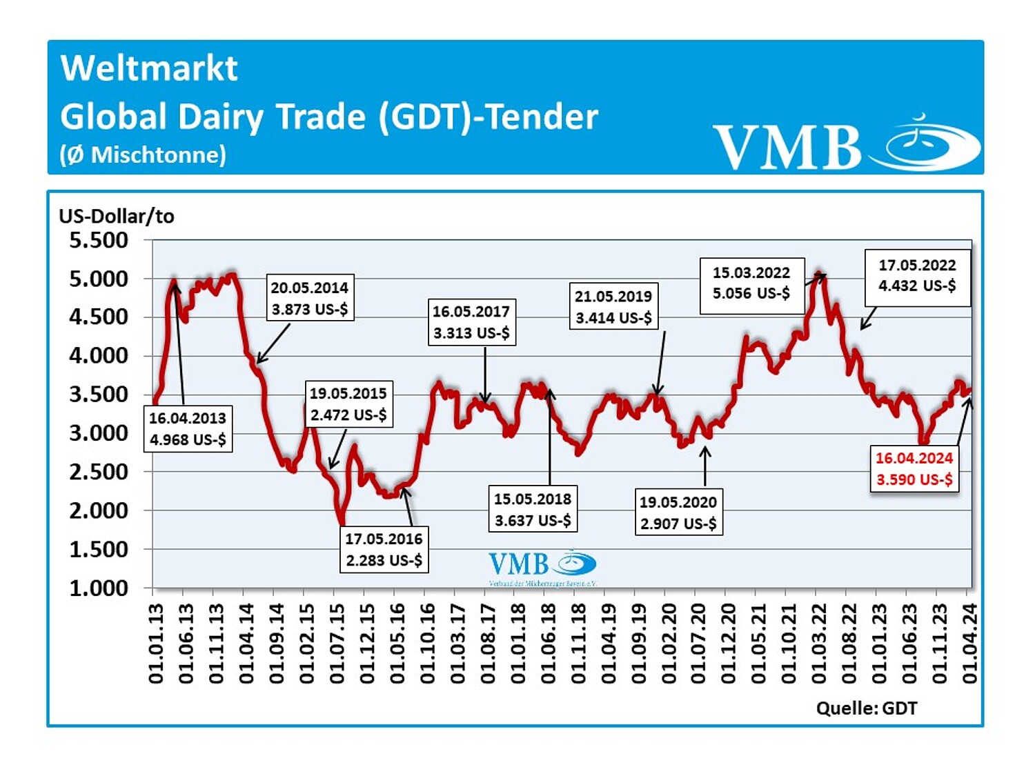 Die Kurse der weltweiten Leitnotierung für Milcherzeugnisse schlossen im zweiten April-Event für eine Mischtonne (Durchschnitt aus den Verkaufserlösen von Milchfett, Milchpulver und Käse) bei 3.590 US-Dollar und konnten sich auf dem bisherigen Niveau behaupten (+0,9 %). Die Handelspreise der einzelnen Milchprodukte entwickelten sich jedoch unterschiedlich. Kursrücknahmen bei Butter und Käse, wenig Veränderungen im Segment des Milchpulvers, Butterschmalzpreise etwas fester. Bei der achten Auktion in diesem Jahr hatte sowohl das Handelsvolumen als auch die Zahl der teilnehmenden Bieter erneut abgenommen. Mit einer Verkaufsmenge von 17.654 Tonnen verlor der Mengenumsatz um knapp 6 % bzw. 1.083 Tonnen gegenüber der letzten Auktion Anfang April.