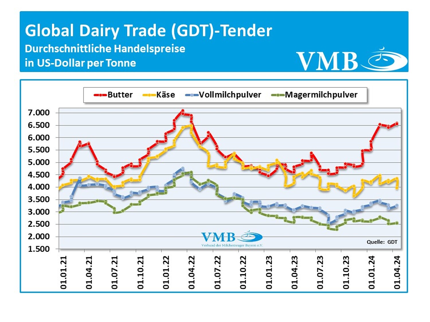 Innerhalb der einzelnen Produkte brachte die jüngste Auktion in Neuseeland unterschiedliche Abschlüsse hervor. Während die Kurse für Butteröl (Butterschmalz) den seit Jahresbeginn festen Preistrend fortsetzte und mit 7.062 US-Dollar ein neues Jahreshoch markierte, wurden die Butterpreise leicht zurückgenommen. Die Erlöse für Butter bewegten sich mit 6.546 US-Dollar rund 0,7 % unter dem bisherigen Niveau. Für spätere Handelstermine verlor der Preisindex teilweise bis zu 1,6 %.  Kräftige Verluste verzeichneten die Verkaufspreise für Cheddar und rutschten unter die bisherige Widerstandslinie von 4.000 US-Dollar. Nach einem Preiszuwachs Anfang April schloss der Preisindex zum Ende des Handelstages bei 3.974 US-Dollar, was einem Rückgang von 8,4 % entspricht. Dieses Preisniveau wurde zuletzt im November 2023 aufgerufen. Auch die Preisvorstellungen für Kontrakte zu späteren Terminen standen unter stärkeren Preisdruck.