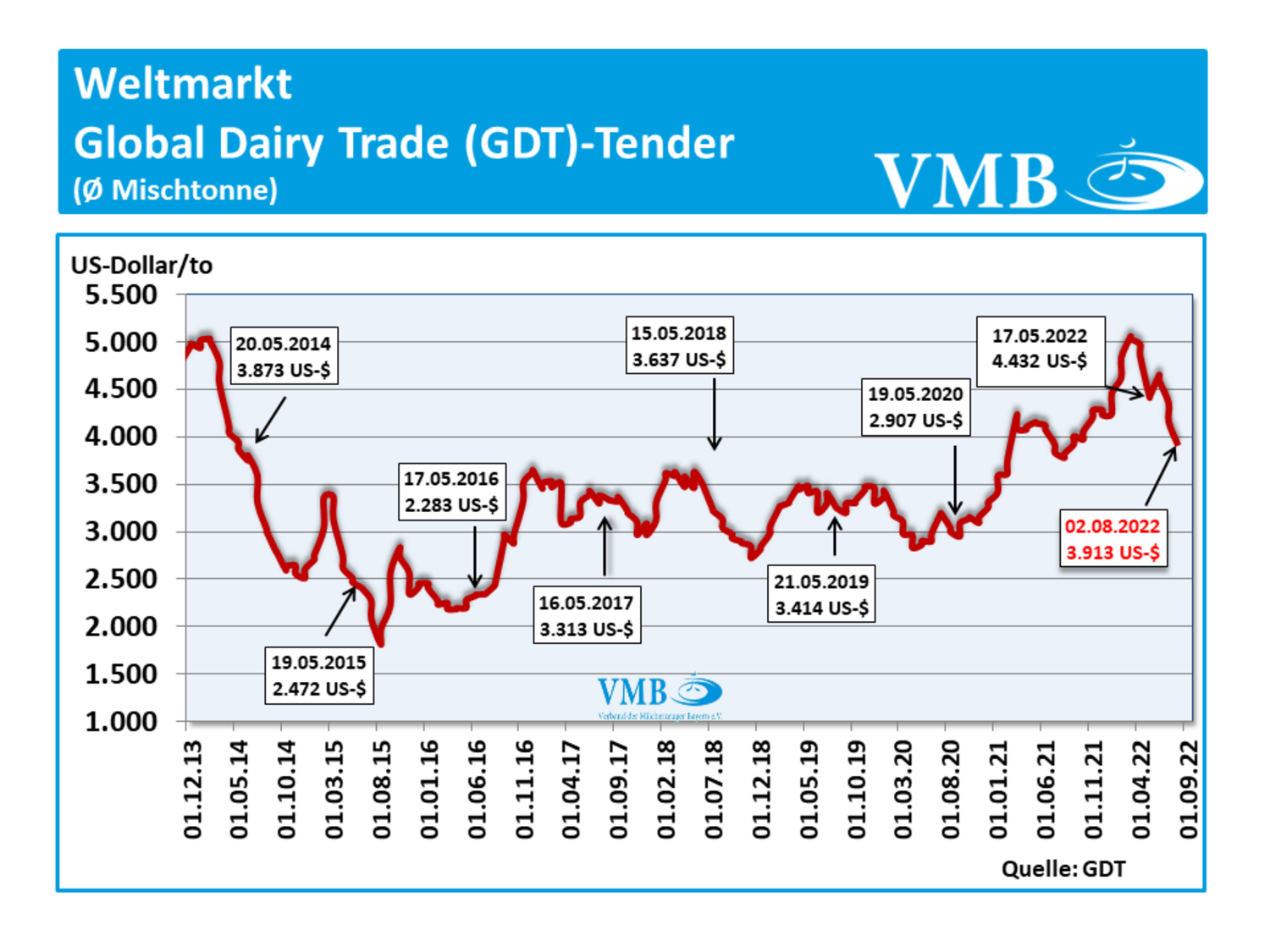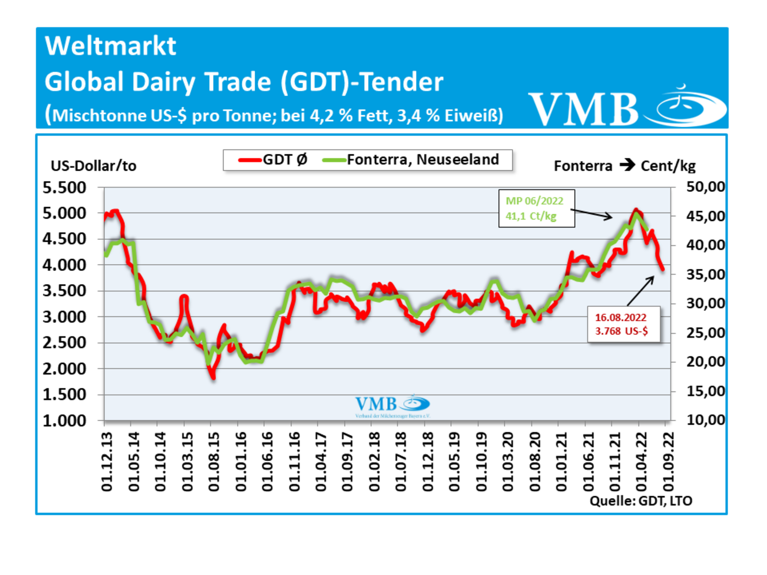 Die Auktion des GDT-Tenders vom 16. August 2022 konnte mit einem durchschnittlichen Handelspreis (Durchschnitt aus den Verkaufserlösen von Milchfett, Milchpulver und Käse) von 3.768 US-Dollar pro Mischtonne abschließen. Zum siebten Mal in Folge seit Mitte Juni haben die GDT-Auktionen rückläufig tendiert. Obwohl das weltweite Milchaufkommen der wichtigsten exportorientierten Milcherzeugerstaaten wie Neuseeland, USA, Australien und auch bei uns hier zum Vorjahr niedriger ausfallen, werden die Märkte zusehends tendenziell durch die wirtschaftlichen sowie politischen Krisen beieinflusst. Die Differenz zum vorherigen Ergebnis beträgt 145 US-Dollar pro Tonne mit einem Minus von 3,7 Prozent zur letzten Auktion am 02. August 2022. Die Preishöhe befindet sich daher auf dem Stand wie vor gut eineinhalb Jahren - allerdings bei einer leicht stabilen Tendenz.