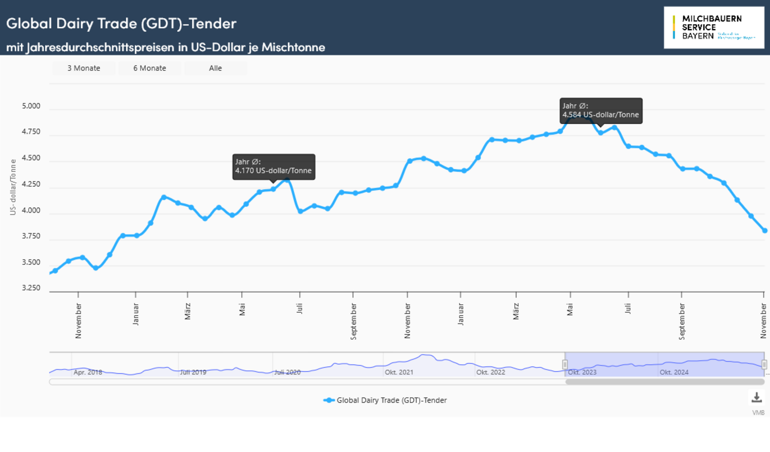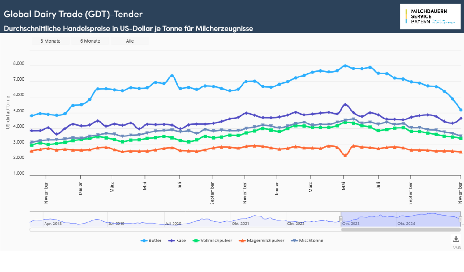 Die seit September stark rückläufige Entwicklung im internationalen Handel mit Milchprodukten fand auch bei der letzten Auktion vom Global Dairy Trade in diesem Jahr kein Ende. Für eine Mischtonne (Durchschnitt aus den Verkaufserlösen von Milchfett, Milchpulver und Käse) haben die Kurse erneut nachgegeben. Die Verkaufspreise für eine Mischtonne verloren gegenüber dem letzten Event um 4,7 % auf 3.341 US-Dollar. Innerhalb der letzten vier Monate sind die Kurse um 22 % gefallen und markierten den niedrigsten Stand seit Dezember 2023. Im Durchschnitt aller Handelstermine 2025 fällt das Jahresergebnis mit 4.130 US-Dollar überdurchschnittlich hoch aus und übertrifft den Jahreswert aus 2024 um rund 350 US-Dollar bzw. gut 9 %. Das Handelsvolumen hatte zum vorausgegangenen Event nur moderat verloren bei einer höheren Anzahl an Bietern. Im Mittel nahmen über das Jahr 168 Bieter (Vorjahr 170) teil mit einer durchschnittlichen Handelsmenge von 28.163 Tonnen (Vorjahr 27.553 t).