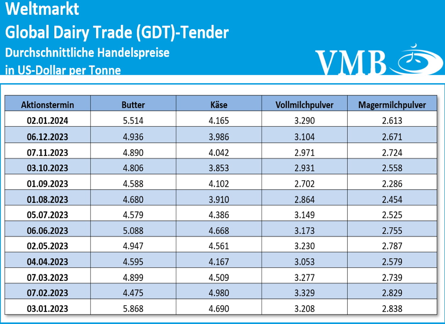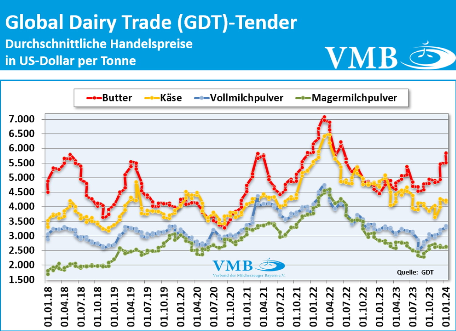 Mit dem Ergebnis des zweiten Börsentermins des GDT-Tenders beweist der globale Milchmarkt seine feste Marktbasis, welche im Herbst letzten Jahres begonnen hat. Beim Handelstermin am 16. Januar 2024 errechnet sich ein Mittelwert von 3.493 US-Dollar je Mischtonne (Durchschnitt aus den Verkaufserlösen von Milchfett, Milchpulver und Käse) und somit eine rechnerische Verbesserung von 130 US-Dollar je Tonne bzw. ein Plus von 3,9 Prozent zur letzten Auktion am 02. Januar 2024. Die Handelsmengen bleiben im Gegensatz zum Herbstgeschäft letzten Jahres unter dem erwarteten Niveau. Es wurden insgesamt knapp 25.000 Tonnen an Commodities-Milchprodukte abgesetzt.