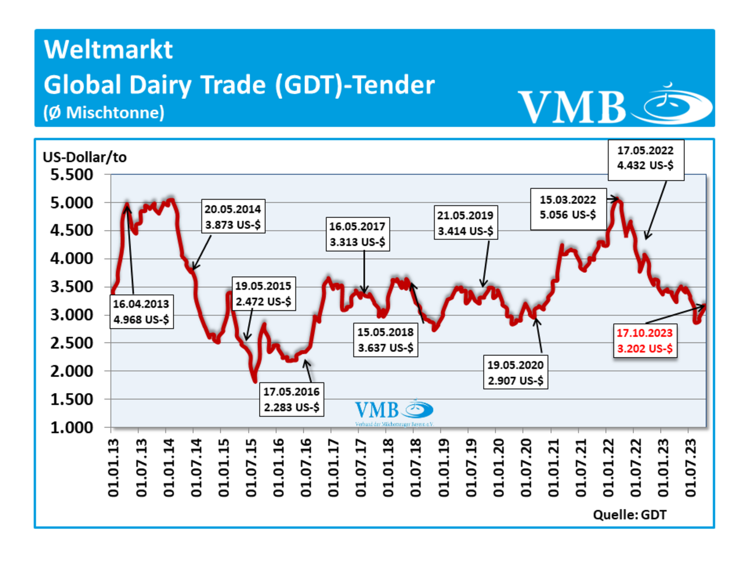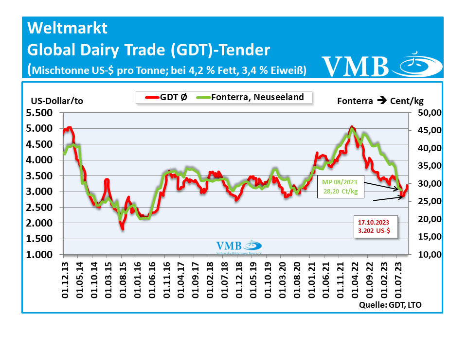 Mit dem einundzwanzigsten Handelstermin vom 17. Oktober 2023 hat es eine erneute Erhöhung des durchschnittlichen Börsenwerts des GDT-Tenders für Milcherzeugnisse gegeben. Somit schließen die beiden Börsentermine wie bereits zum Vormonat im November 2023 positiv ab. Die Preisnotierung verzeichnet einen Mittelwert von 3.202 US-Dollar je Mischtonne (Durchschnitt aus den Verkaufserlösen von Milchfett, Milchpulver und Käse) und weist somit einen Anstieg von 3,2 Prozent bzw. ein Plus von 98 US-Dollar zur Notierung vom 03. Oktober 2023 auf. Das Handelsvolumen der Auktion von fast 36.000 Tonnen bleibt weiterhin im mehrjährigen Vergleich auf einer sehr hohen Position.