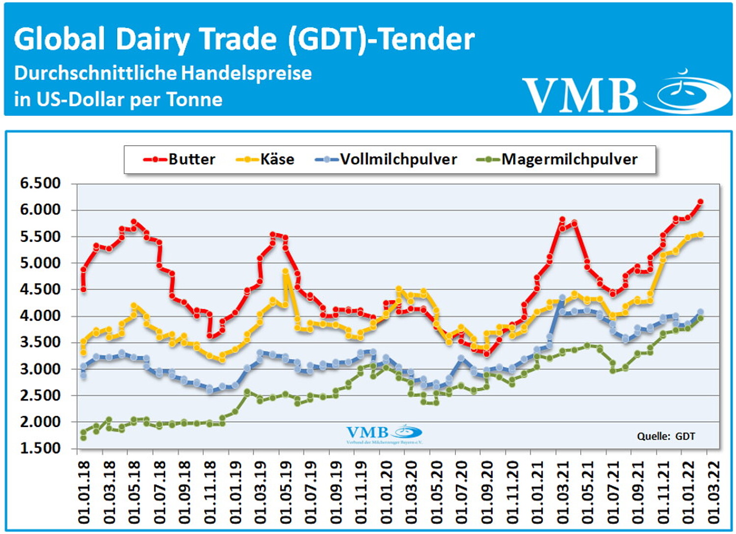 Das zweite Handelsergebniss der Auktion des Global Dairy Trade beweist beeindruckend, dass sich der Milchmarkt im neuen Jahr allgemein deutlich festigt. Die Auktion des GDT-Tenders vom 18. Januar 2022 zeigt den durchschnittlichen Handelspreis (Durchschnitt aus den Verkaufserlösen von Milchfett, Milchpulver und Käse) von 4.463 US-Dollar pro Mischtonne. Das Ergebnis spiegelt das hohe und stabile Niveau mit leicht anziehender Tendenz im Vergleich zu den vorherigen Auktionen im Jahr 2021. Der Durchschnittspreis hat um 216 US-Dollar pro Mischtonne gegenüber der letzten Auktion am 04. Januar 2022 deutlich angezogen. Prozentual liegt die Erhöhung bei 5,1 Prozent.