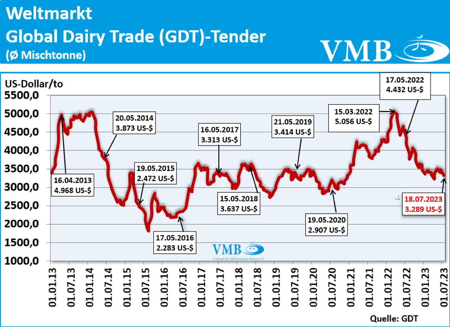 Mit dem fünfzehnten Handelstermin hat der durchschnittliche Börsenwert des GDT-Tenders für Milcherzeugnisse wieder einen weiteren Rückschritt eingenommen. Die Börsenpreise haben in den letzten Notierungen ein „stetiges“ auf und ab aufgezeichnet. Die aktuelle Preisnotierung verzeichnet einen Mittelwert von 3.289 US-Dollar je Mischtonne (Durchschnitt aus den Verkaufserlösen von Milchfett, Milchpulver und Käse) und weist somit einen Rückgang von 1,3 Prozent bzw. 45 US-Dollar auf. Das Handelsvolumen hat sich leicht verbessert, so dass rund 26.000 Tonnen an Milcherzeugnissen abgesetzt werden konnten.