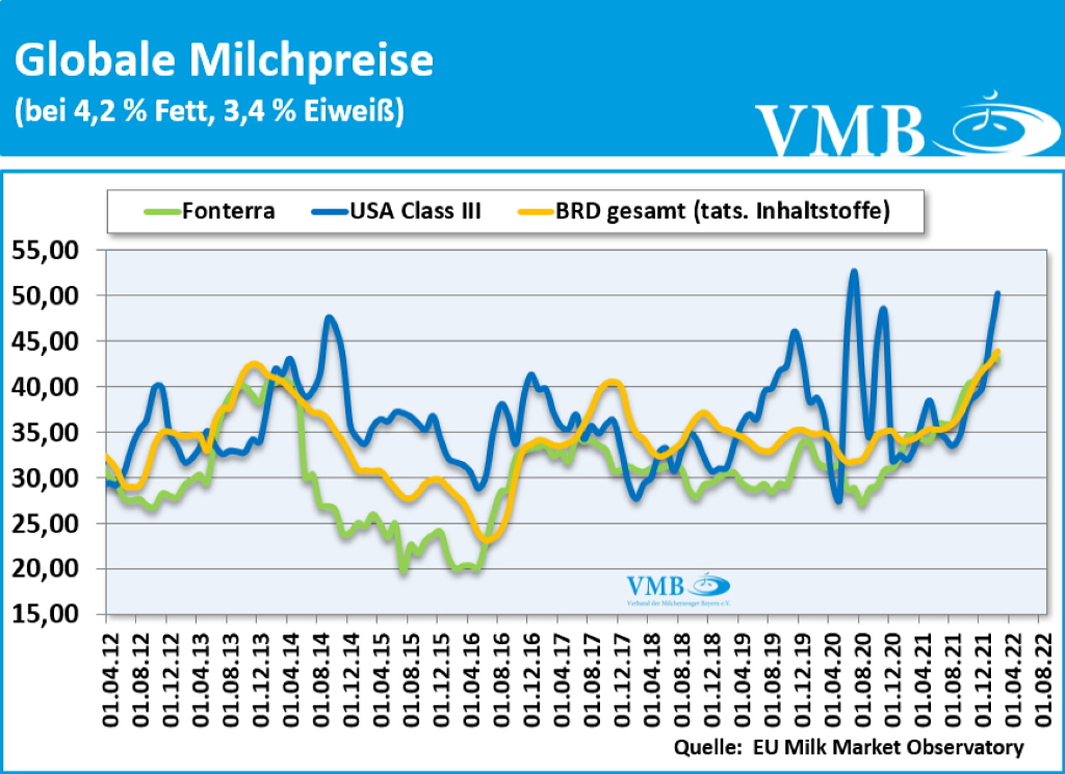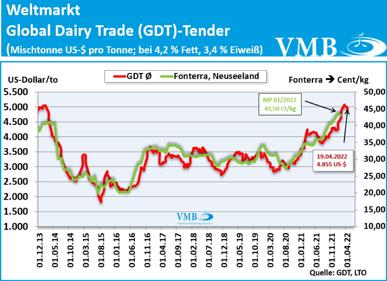 Die Auktion des GDT-Tenders vom 19. April 2022 konnte mit einem durchschnittlichen Handelspreis (Durchschnitt aus den Verkaufserlösen von Milchfett, Milchpulver und Käse) von 4.855 US-Dollar pro Mischtonne abschließen. Dies ist in diesem Jahr der dritte Rückgang in Folge beim Verkauf von Milchprodukten auf der internationalen Handelsplattform. Die Differenz gegenüber der Auktion vom 05.04.2022 beträgt nur 126 US-Dollar pro Tonne, das bedeutet einen Rückgang von 2,5 Prozentpunkten. Trotz des Rückgangs unterstreicht das Ergebnis, durch die Platzierung um die 5.000 US-Dollar-Linie, die Festigung im internationalen Markt für Milcherzeugnisse.