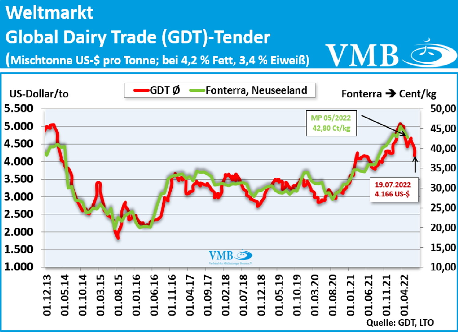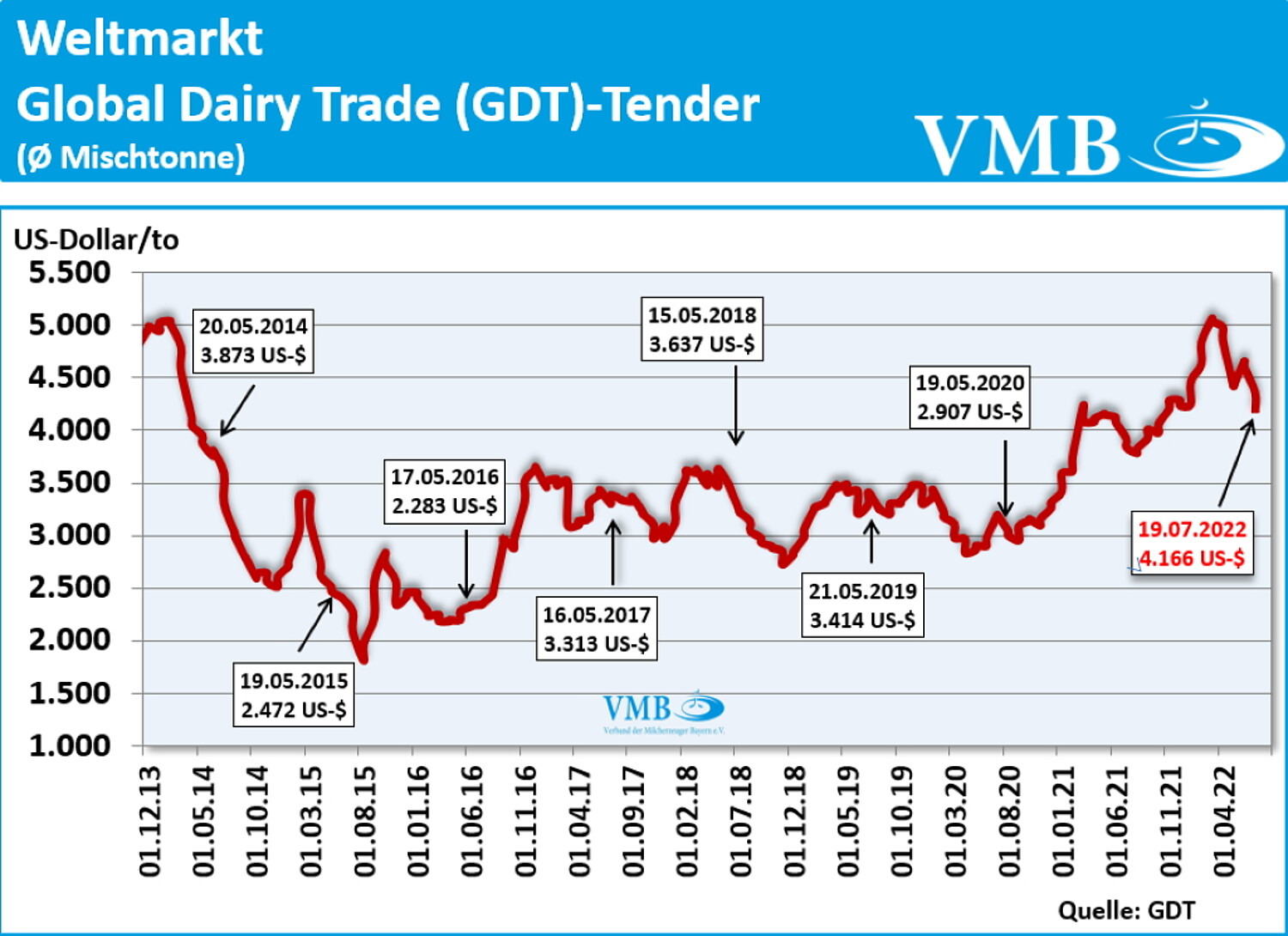 Die Auktion des GDT-Tenders vom 19. Juli 2022 konnte mit einem durchschnittlichen Handelspreis (Durchschnitt aus den Verkaufserlösen von Milchfett, Milchpulver und Käse) von 4.166 US-Dollar pro Mischtonne abschließen. Nach einer vorläufigen gefestigten Marktphase im zweiten Jahresquartal 2022 schließen die GDT-Auktionen zum Beginn der zweiten Jahreshälfte deutliche schwächer ab. Die Differenz zum vorherigen Ergebnis beträgt erneut wieder fast 200 US-Dollar pro Tonne mit einem Minus von 4,5 Prozent zur letzten Auktion am 07. Juli 2022. Damit erreicht das jetzige Ergebnis wieder Werte wie zum Jahresende 2021. Der Abstand zur vorerst besten Auktion am 03. März 2022 befindet sich nun bei fast 900 US-Dollar.