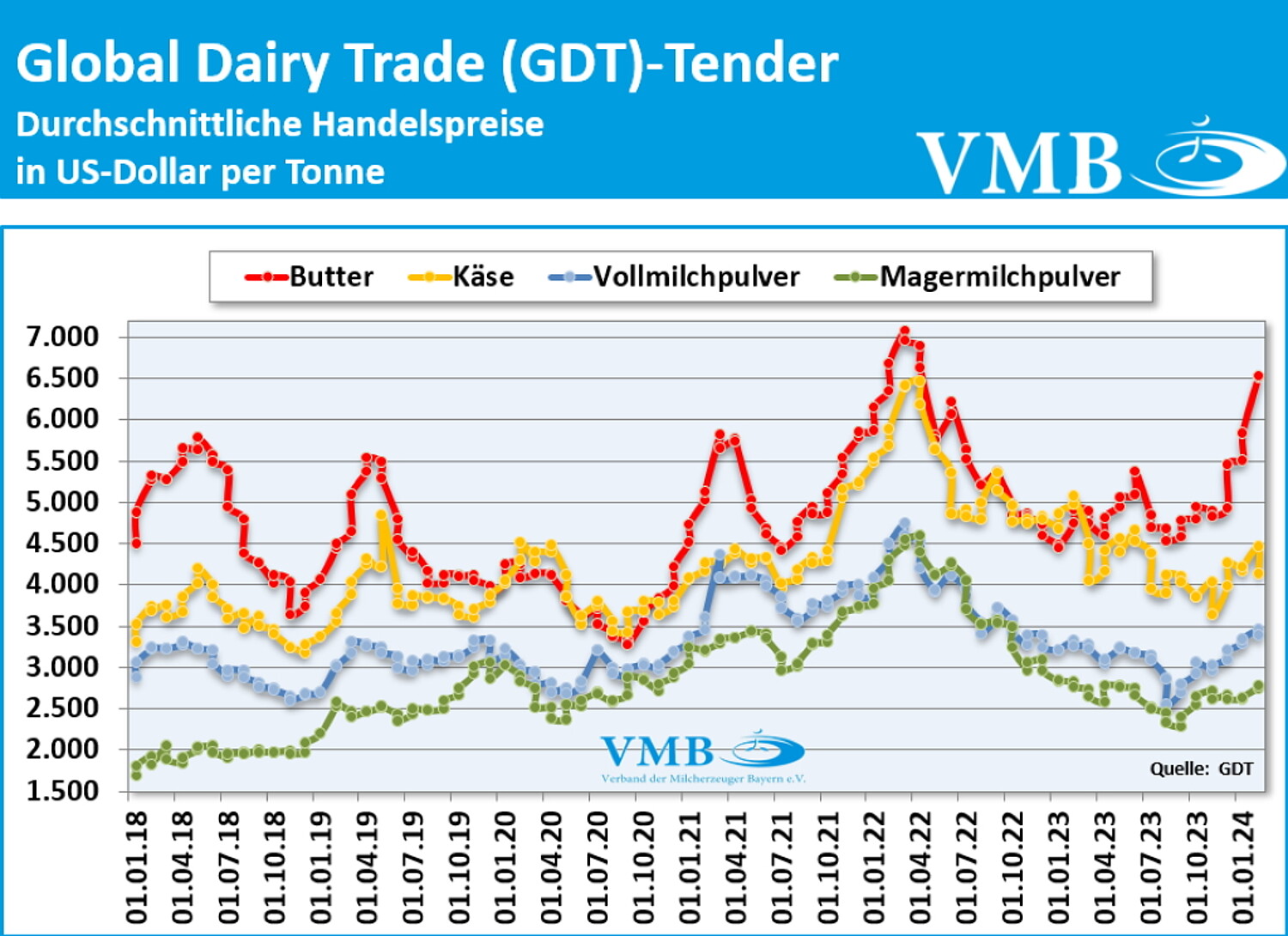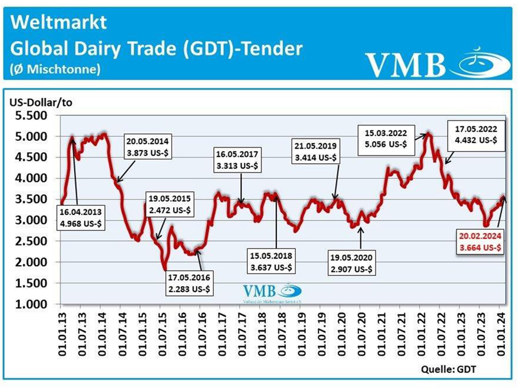Die zuletzt freundliche Entwicklung setzte sich an der Auktion vom 20. Februar 2024 fort. Im aktuellen Ergebnis wurde die Mischtonne zu je 3.664 US-Dollar gehandelt. Gegenüber der letzten Auktion befestigt sich der GDT-Tender um 93 US-Dollar bzw. 2,6 Prozent. Die Mischtonne errechnet sich aus den Verkaufserlösen von Milchfett, Milchpulver und Käse. Mit einem Handelsvolumen von 24.306 Tonnen verlor die Menge um 4,9 Prozent und erreichte somit das niedrigste Volumen im bisherigen Jahresverlauf.