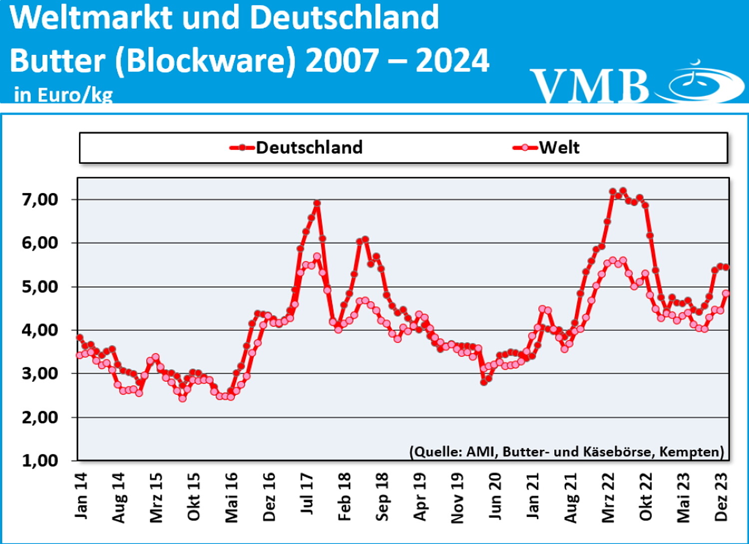 Die Verkaufserlöse innerhalb der einzelnen Produkte entwickelten sich unterschiedlich. Das Segment der Milchfette wurde von einer anhaltend freundlichen Verkaufsstimmung geprägt. Den deutlichsten Zuwachs verzeichnete Butteröl (Butterschmalz). Der Preisindex erreichte mit einem Plus von 8,6 Prozent gegenüber der letzten Auktion ein Erlösniveau von 6.552 US-Dollar, was den bisherigen Jahreshöchststand markiert. Für Butter legten die Erlöse, nach einer zweistelligen Steigerungsrate Anfang Februar, moderat um 0,2 % auf 6.526 US-Dollar je Tonne zu. Auf diesem Niveau bewegen sich die Weltmarktpreise gleich auf mit den europäischen Butterpreisen. Der seit Jahresbeginn rückläufige Trend bei Mozzarella wurde in der aktuellen Auktion gestoppt. Bei Verkaufserlösen von 3.960 US-Dollar je Tonne erhöhte sich der Marktwert um 7,9 %. Im Handel mit Chester/Cheddarkäse verloren die Verkaufspreise um 326 US-Dollar je Tonne (-7,3 Prozent) und pendelten sich bei 4.143 US-Dollar je Tonne ein. Während sich bei Magermilchpulver die feste Entwicklung aus den vergangenen Auktionen in der zweiten Februarhälfte fortsetzte und zu Börsenschluss ein Niveau von 2.788 US-Dollar je Tonne (+1,3 Prozent) erzielte, hatten sich die Erlöse für Vollmilchpulver abgeschwächt. Das Niveau bewegte sich mit 3.388 US-Dollar je Tonne 2,2 Prozent unter dem zuletzt aufgerufenen Auktionspreis. Beim Blick auf die Futures für spätere Handelstermine zeichnete sich über nahezu alle Milcherzeugnisse eine stabile Preisentwicklung ab. Vor diesem Hintergrund wird auch für den März ein stabiles Umfeld im internationalen und nationalen Milchhandel erwartet.