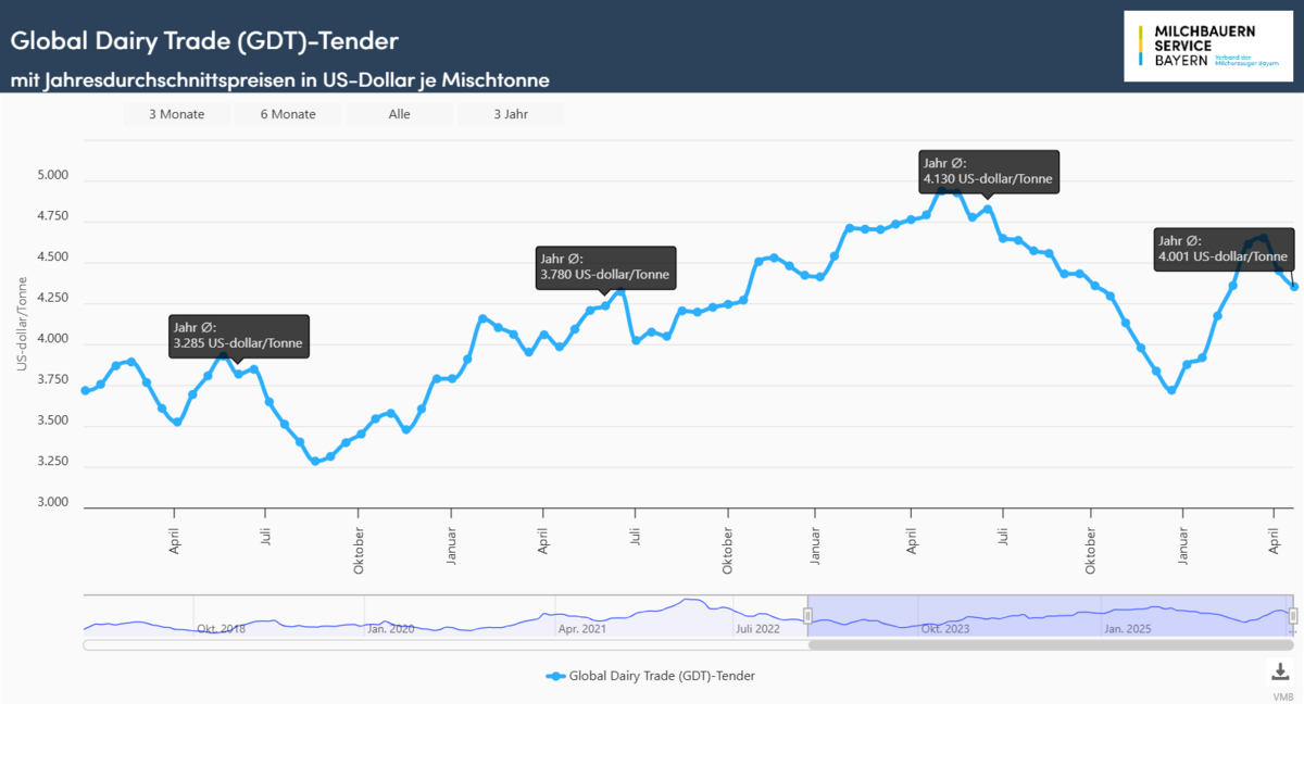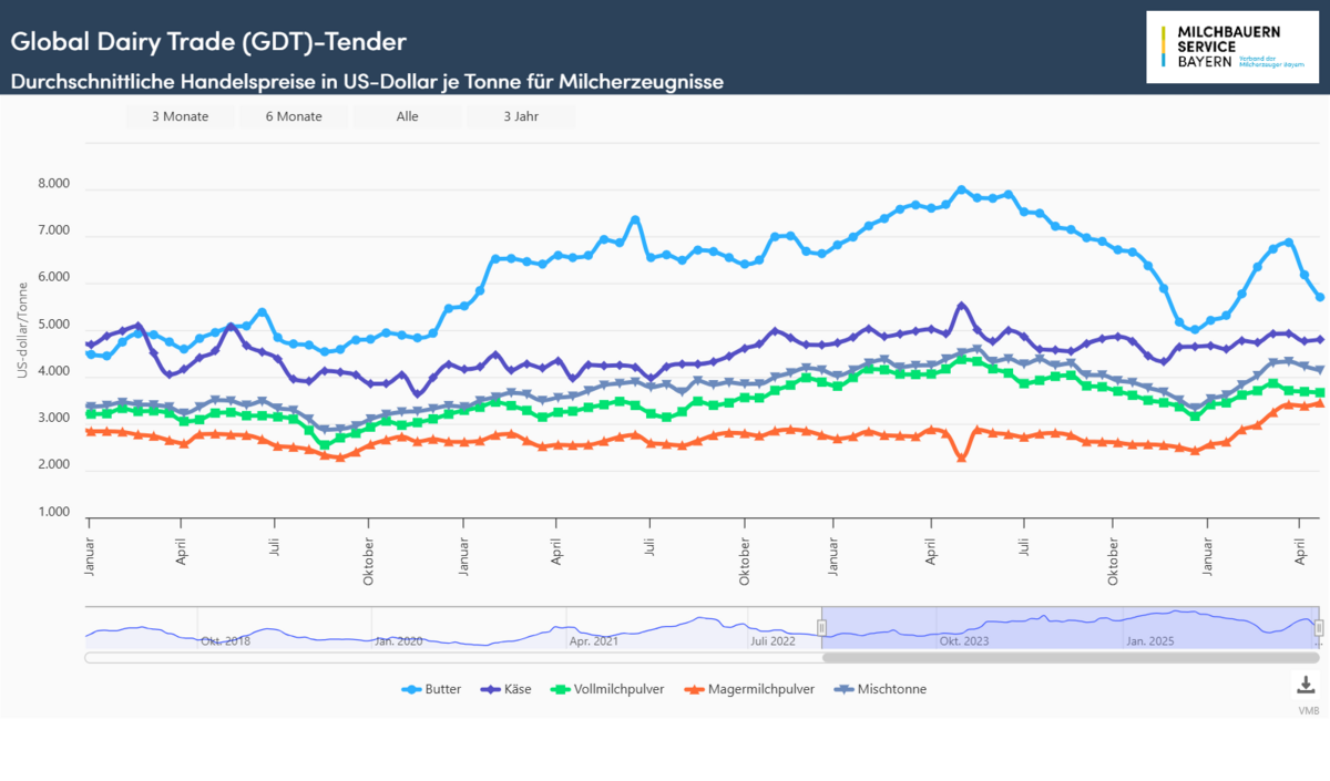 Unter erneutem Preisdruck stand im April der Handel mit Butter und wasserfreiem Milchfett. Die Schlusskurse für Butter hatten die Linie von 6.000 US-Dollar nach unten durchschritten und verloren um 479 US-Dollar bzw. 7,7 % auf 5.702 US-Dollar/t. Der Rückstand zum Vorjahr bewegt sich bei knapp 2.000 US-Dollar bzw. gut 25 %. Einen noch deutlicheren Rückgang mussten die Verkaufspreise für wasserfreies Milchfett hinnehmen. Die Kurse verloren um 670 US-Dollar (-9,5 %) auf 6.357 US-Dollar. Rückläufig war die Kursentwicklung auch bei Mozzarella (-2,4 %) und Vollmilchpulver (-0,6 %).