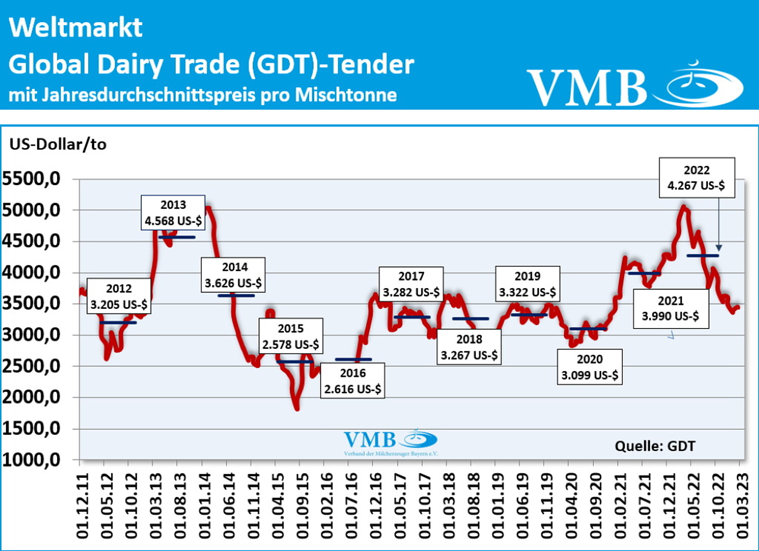 Das vierte Börsenergebnis des GDT-Tenders in diesem Jahr zeigt durchschnittlich wieder eine kleine Abschwächung von Milcherzeugnissen, welche international als Standardprodukte gehandelt werden. Ob die leichte Preissenkung in die „Aschermittwoch-Faschingsstimmung“ einzuordnen ist, bleibt abzuwarten. Generell bestehen eigentlich feste Marktparameter wie ein weltweit normales Milchaufkommen und eine gestärkte Nachfrage. Die kommenden Börsentermine werden es zeigen. Die aktuelle Preisnotierung verzeichnet bei einem Mittelwert von 3.414 US-Dollar je Mischtonne (Durchschnitt aus den Verkaufserlösen von Milchfett, Milchpulver und Käse) eine leichte Eintrübung von 42 US-Dollar je Tonne als vor 14 Tagen, also eine Senkung von 1,2 Prozent. Die Handelsmenge der Auktion hat wieder die Linie von über 30.000 Tonnen überschritten.