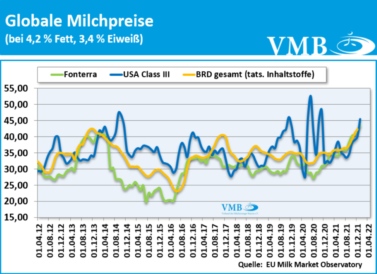 Die Auktion des GDT-Tenders vom 05. April 2022 konnte mit einem durchschnittlichen Handelspreis (Durchschnitt aus den Verkaufserlösen von Milchfett, Milchpulver und Käse) von 4.981 US-Dollar pro Mischtonne abschließen. Dies ist in diesem Jahr der zweite Rückgang in Folge beim Verkauf von Milchprodukten auf der internationalen Handelsplattform. Die Differenz gegenüber der Auktion vom 15.03.2022 beträgt allerdings nur 58 US-Dollar pro Tonne, das bedeutet einen Rückgang von 1,15 Prozentpunkten. Trotz des Rückgangs unterstreicht das Ergebnis, durch die Platzierung an der 5.000 US-Dollar-Linie, die Festigung im internationalen Markt für Milcherzeugnisse.