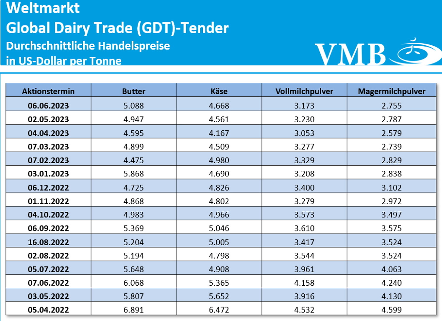 Mit dem elften Handelstermin zeigt der durchschnittliche Börsenwert des GDT-Tenders für Milcherzeugnisse noch nicht eindeutig, dass der Welthandel noch nicht die stabile Phase erreicht hat, welches für die Marktteilnehmer als entsprechendes Signal wünschenswert wäre. Die aktuelle Preisnotierung verzeichnet einen Mittelwert von 3.399 US-Dollar je Mischtonne (Durchschnitt aus den Verkaufserlösen von Milchfett, Milchpulver und Käse) und weist somit einen Rückgang von 89 US-Dollar bzw. ein Minus von 2,6 Prozent auf. Das Handelsvolumen zeigt zur vorherigen Auktion im Vergleich eine leichte Verbesserung auf und meldet eine Vermarktungsgesamtmenge von etwas mehr als 23.000 Tonnen.