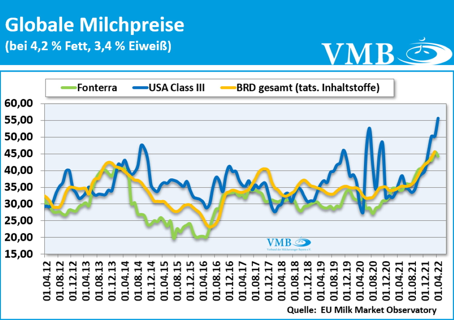 Obwohl der chinesische Import von Agrarprodukten allgemein noch unter den Lockdown-Corona-Bestimmungen nicht voll umgesetzt werden konnte, haben sich doch die meisten Milchprodukte im weltweiten Handel annähernd halten können. Vollmilchpulver (VMP), das wichtigste Produkt für den chinesischen Markt, konnte nicht ganz an das Vorjahr aufschließen. Knapp 100.000 Tonnen VMP wurden in den ersten drei Monaten von den größten Milchproduktionsländern weniger exportiert. Auch die beiden anderen Milchpulversorten litten unter den Corona-Pandemiebeschränkungen. Der Absatz bei Molkenpulver ging um 60.000 Tonnen zurück und bei Magermilchpulver schränke sich das Handelsvolumen um knapp 20.000 Tonnen ein. Freundlich gestaltet sich dagegen die Absatzmenge bei Butter und Käse. Bei Milchfett erhöhte sich der Bedarf sogar um 15.000 Tonnen, sodass im ersten Jahresquartal 2022 knapp 250.000 Tonnen Butter verkauft wurden. Käse bleibt weitestgehend unverändert im Handel und verzeichnet nur einen ganz geringen Rückgang um 3.000 Tonnen auf 600.000 Tonnen Gesamtvolumen. Wären die derzeitigen Wirrungen im Handel durch kriegerische Auseinandersetzungen und der immer noch andauernden Corona Pandemie vorüber, würden die Mengen im globalen Handel die Vorjahreswerte auf alle Fälle halten, wenn nicht sogar verbessern. Fraglich ist dennoch wie einige wichtige Importstaaten für Milcherzeugnisse auf die anziehenden Verkaufspreise reagieren bzw. sich nicht mehr im vollen Umfang die Milcherzeugnisse leisten können. Dafür erhalten aber die Milcherzeuger durch die Erlöse über den Weltmarkt aktuell rund 45 Cent/kg Milchgeld (lt. EU-Kommission Milchpreisauszahlung FONTERRA, Neuseeland für April 2022).