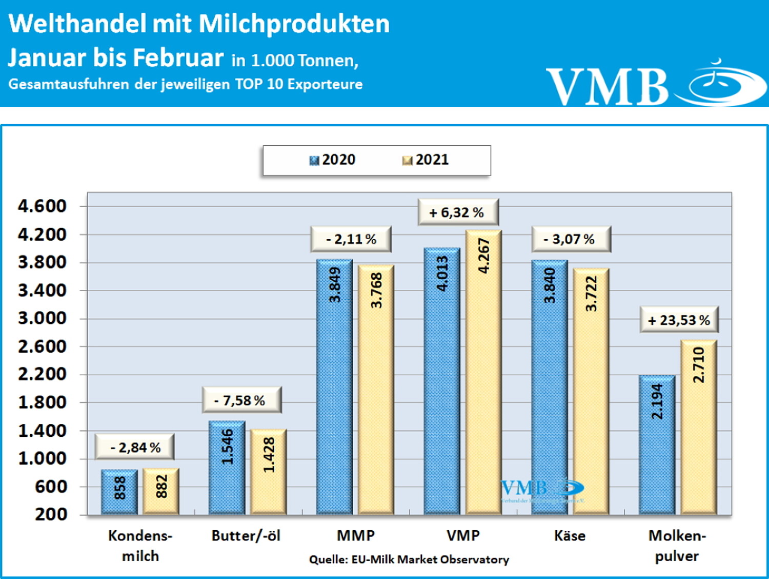Die Absätze von Käse und Butter liegen in den ersten beiden Monaten des Kalenderjahres 2021 leicht hinter den Erwartungen des Vorjahres zurück. Allerdings ist bei den größten globalen Kaufinteressenten, die eigentlich den Export bestimmen und einen hohen Milchbedarf haben, die wirtschaftliche Substanz gegenwärtig sehr gut, denn der Erdölverkauf, eine der wichtigsten Einnahmequellen, befindet sich auf relativ hohem Niveau. Demzufolge ist damit zu rechnen, dass ein Nachfrageschub in den kommenden Monaten entstehen wird. Angesichts dieser Marktsituation werden möglicherweise die globalen Handelsmengen wieder den Stand des Vorjahres erreichen beziehungsweise die Vorjahresergebnisse übertreffen.