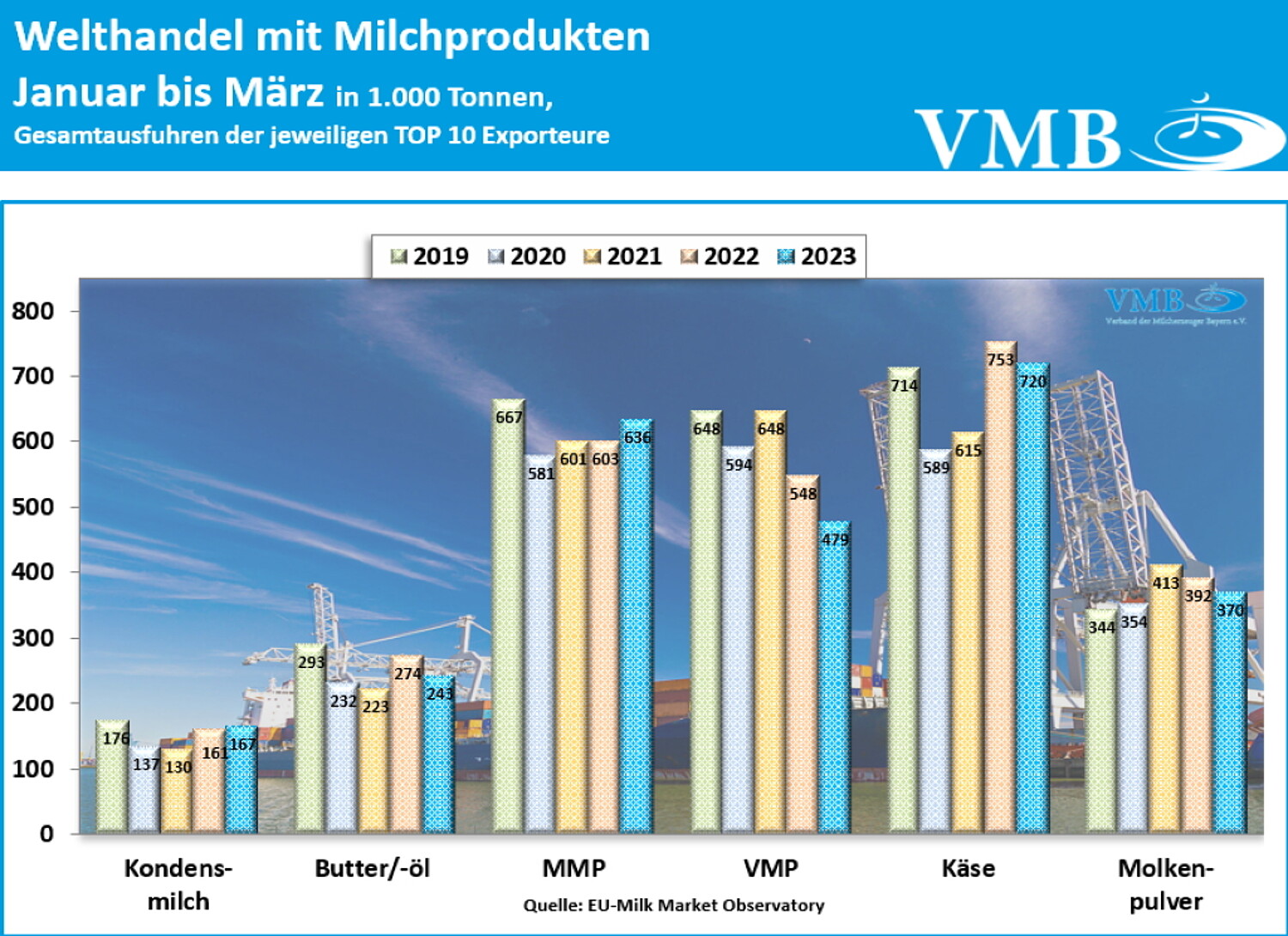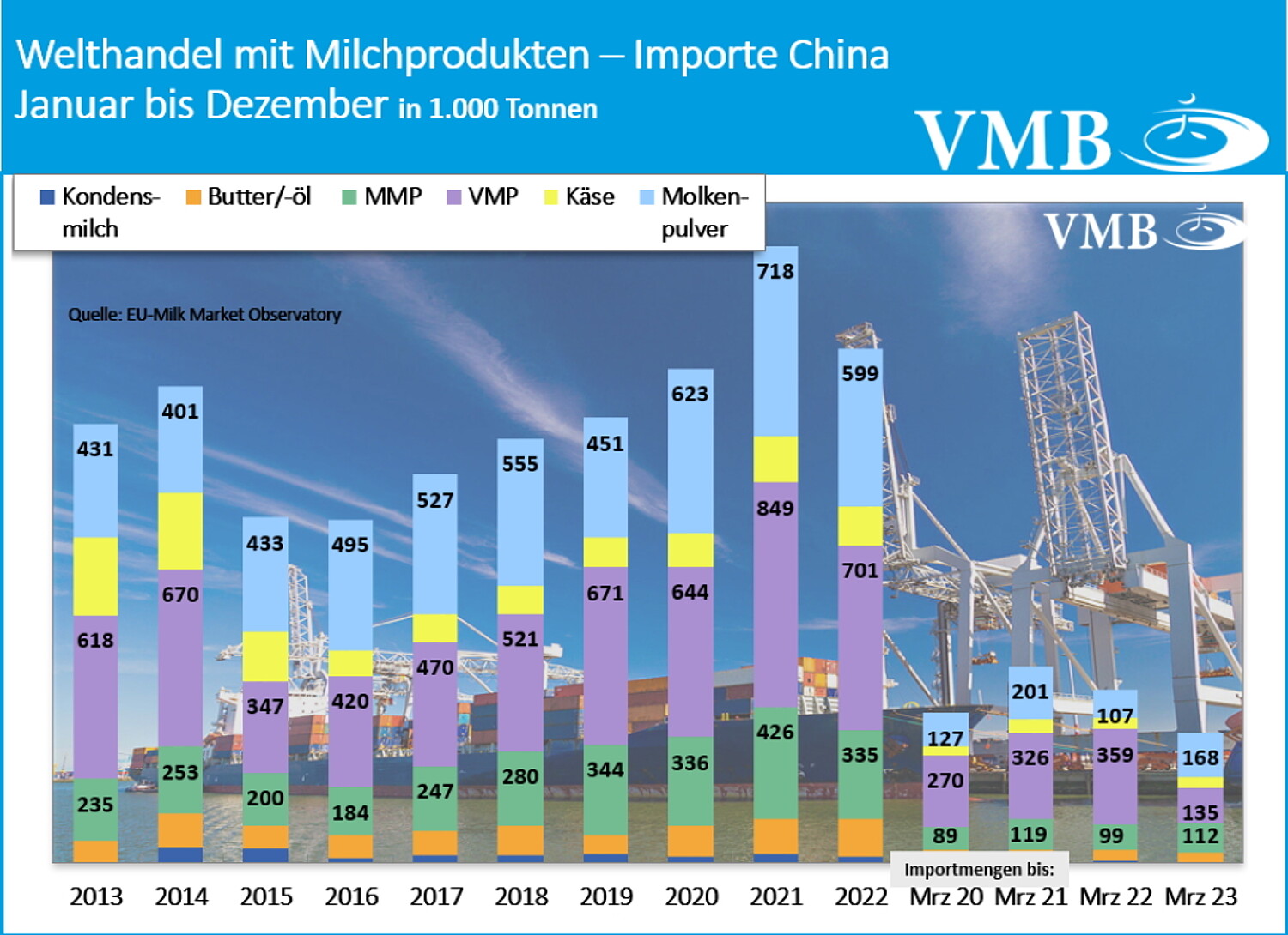 Die Handelsstatistik von den weltweit größten Exportländer mit klassischen Milchprodukten, nach Erhebung der Europäischen Union, registriert weiter einen Rückstand zu den vergangenen Jahren. Obwohl die Corona Pandemie eigentlich weltweit überwunden wurde und die kriegerischen Auseinandersetzungen in Osteuropa nicht mehr ganz den globalen Handel reflektieren, sind die gehandelten Mengen an Milcherzeugnissen, im Vergleich, noch im Rückstand. Gleichfalls sind die verkaufen Margen im GDT-Tender nicht auf dem sonst gewohnten Niveau. Nach wie vor kauft auch China nicht im gewohnten Umfang der letzten Jahre international Milchprodukte ein. Z. B. verringerte sich die Einfuhrmenge bei Vollmilchpulver im ersten Jahresviertel um über 60 Prozent, so dass das aktuelle Volumen von 370.000 Tonnen auf 135.000 Tonnen geschwunden ist. Magermilchpulver wurde etwas höher nachfragt, aber nicht in der Dimension wie bei Vollmilchpulver.
