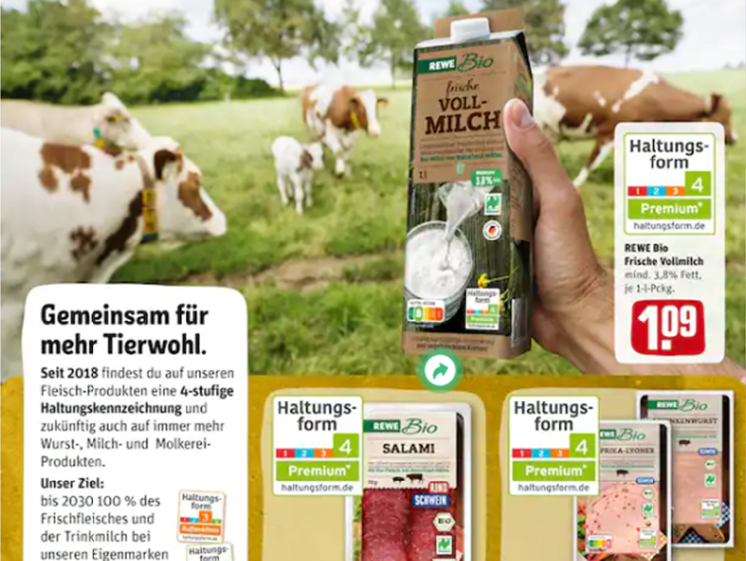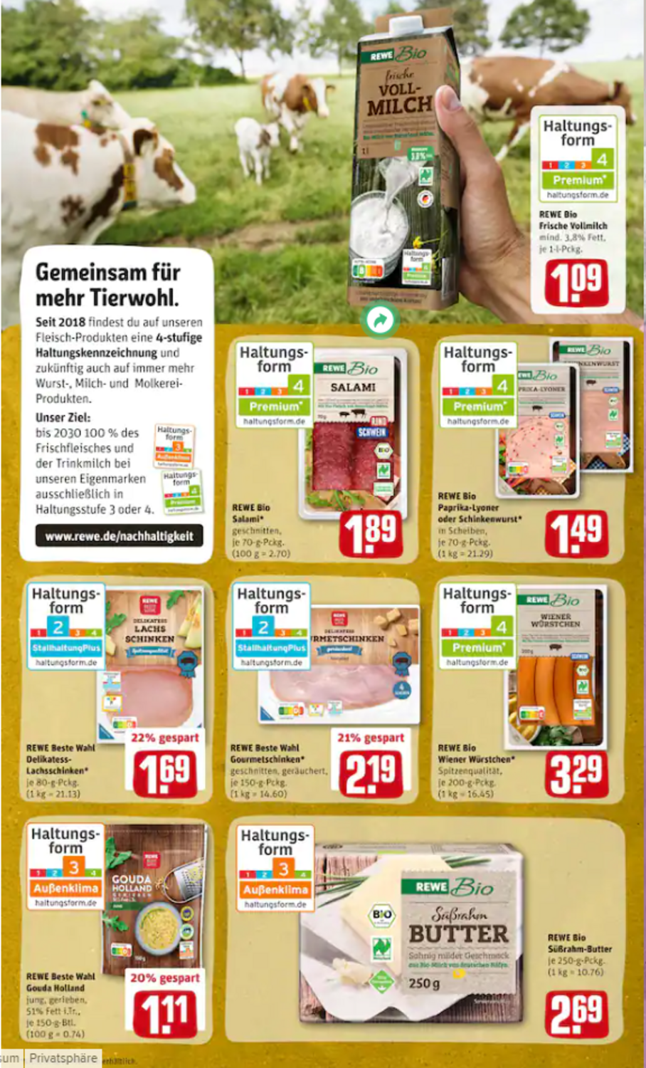 Von daher hat der aktuelle Wochenprospekt von Rewe durchaus überrascht: Denn neben der nachvollziehbaren und bereits seit einiger Zeit umgesetzten Auslobung der Haltungsform 4 bei der Rewe-Eigenmarke für frische Biomilch tauchte auch Bio-Butter und holländischer Reibekäse aus konventioneller Erzeugung in der Werbebotschaft auf. Die Einsortierung des geriebenen Gouda in Haltungsstufe 3 erfolgte wohl auf der Grundlage der Bestimmungen der Kriterien des Programms "Pro Weideland". Nicht ganz stimmig ist dagegen die Deklaration der Rewe-eigenen Biobutter, die aus der Produktion einer bayerischen Genossenschaftsmolkerei stammt. Denn diese ist im Prospekt nur mit Haltungsform 3 versehen, was nicht konform geht mit der bisher bekannten und bereits beschriebenen Handhabung, auch im Sinne der Nachvollziehbarkeit und vor allem Honorierung durch die Verbraucherschaft.